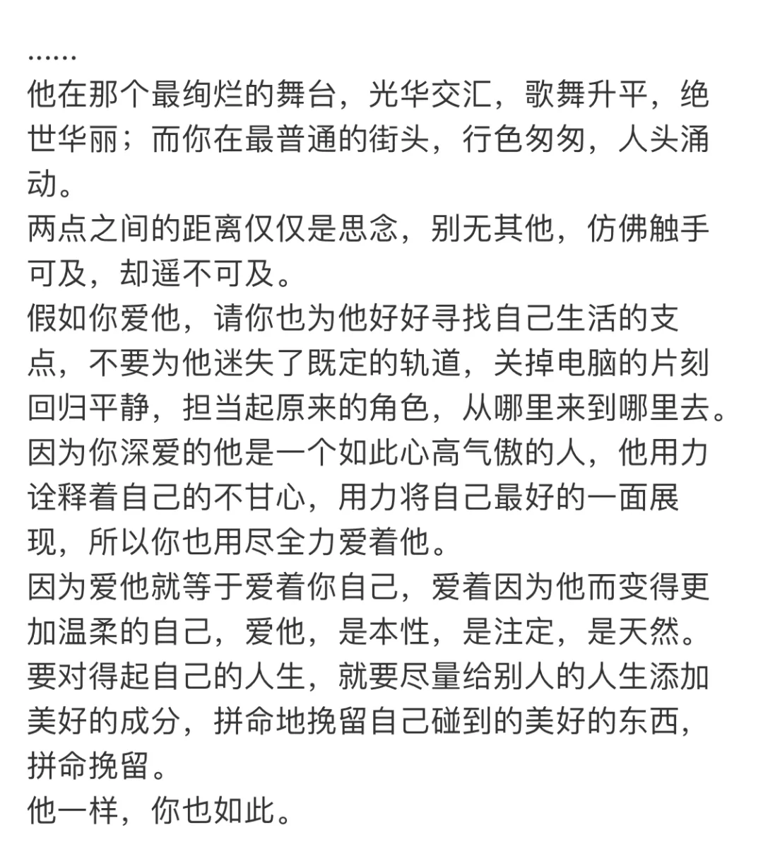 这种热爱和喜欢,可能无法言表,这种欢乐和唯一感,可能在别的地方很难获得,可你要清楚的认知到那就是你感知世界的全部,也是你未知世界永无交集的一点,就像蔡康永在《送给追星孩子的一封信》里写到的一样: