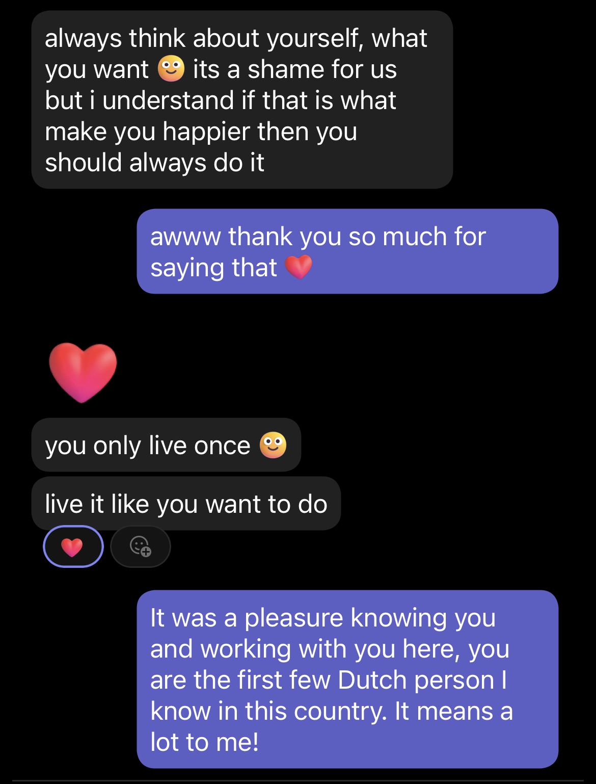 上周一拿到新公司发来的正式offer,周二在内心各种纠结难过中终于瞅准机会鼓起勇气向老板提了离职。因为这是自己在荷兰的第一份工作,老板以及每天低头不见抬头见的同事们是我最先认识的一帮荷兰人,这份工作对我意义重大,于是开口说要离开真的不容易。