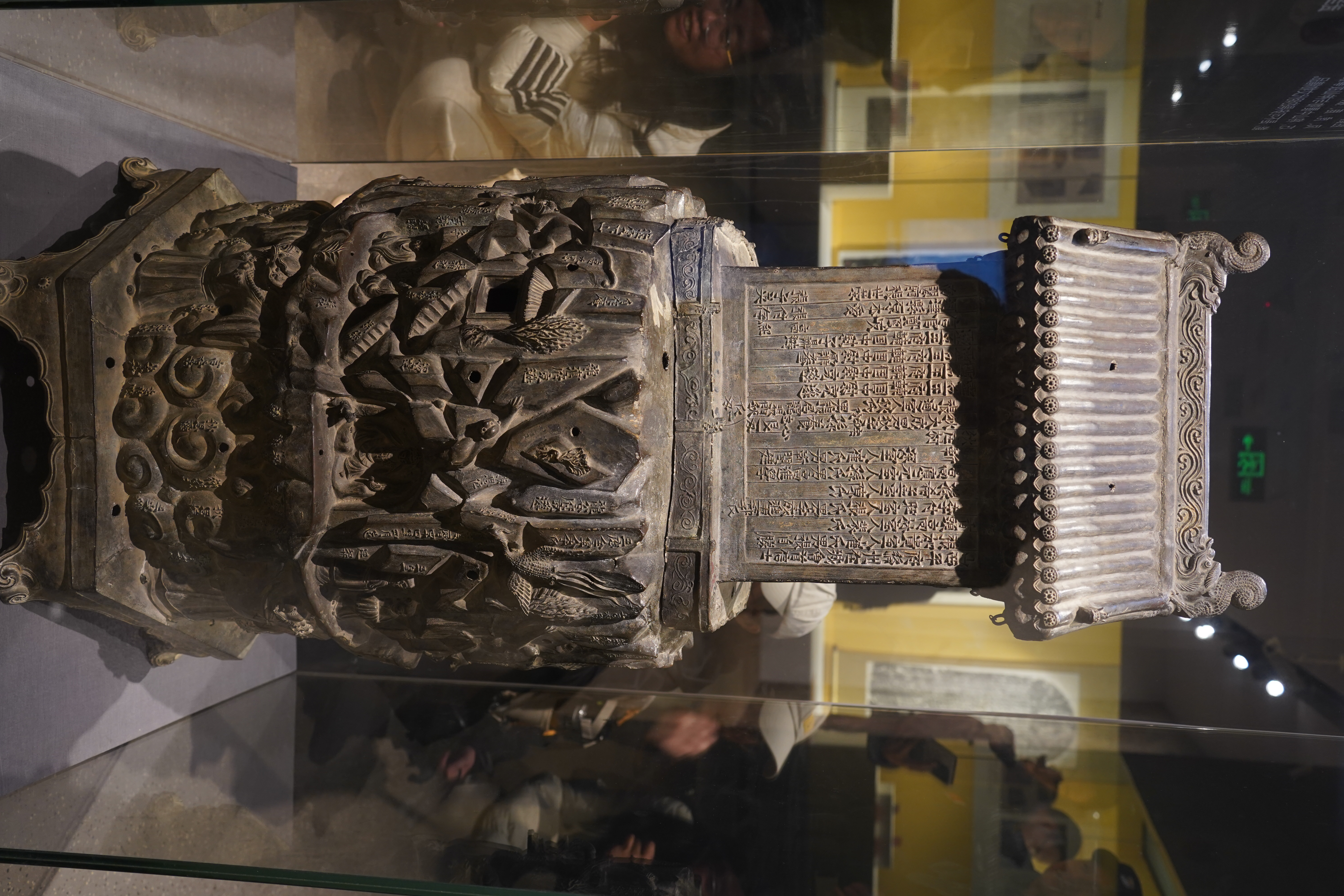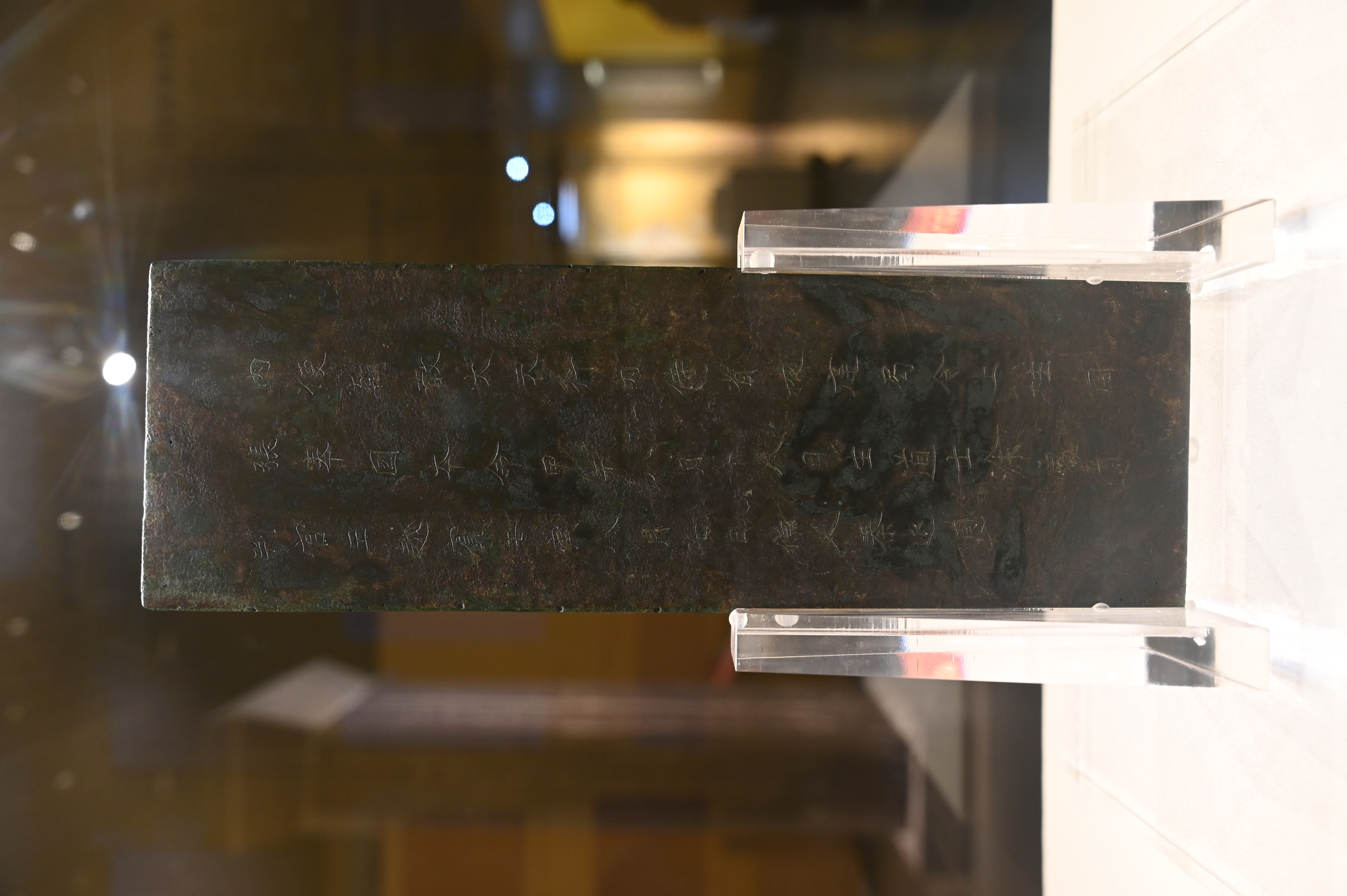 传清道光年间湖南衡山水帘洞投龙潭出水,贵州省博物馆藏,介绍:开元二十六年,53岁的唐玄宗派遣内侍张奉国带道士孙智凉等人专程从长安来到南岳紫盖洞投放的铜简。盖简于道光年间出水后,1939年故宫文物南迁到贵州安顺华严洞,时任教育部南京古物保存所所长舒楚石请托将此投龙简一同南迁,后代管文物移交安顺民众教育馆,1953年入藏贵州省博物馆