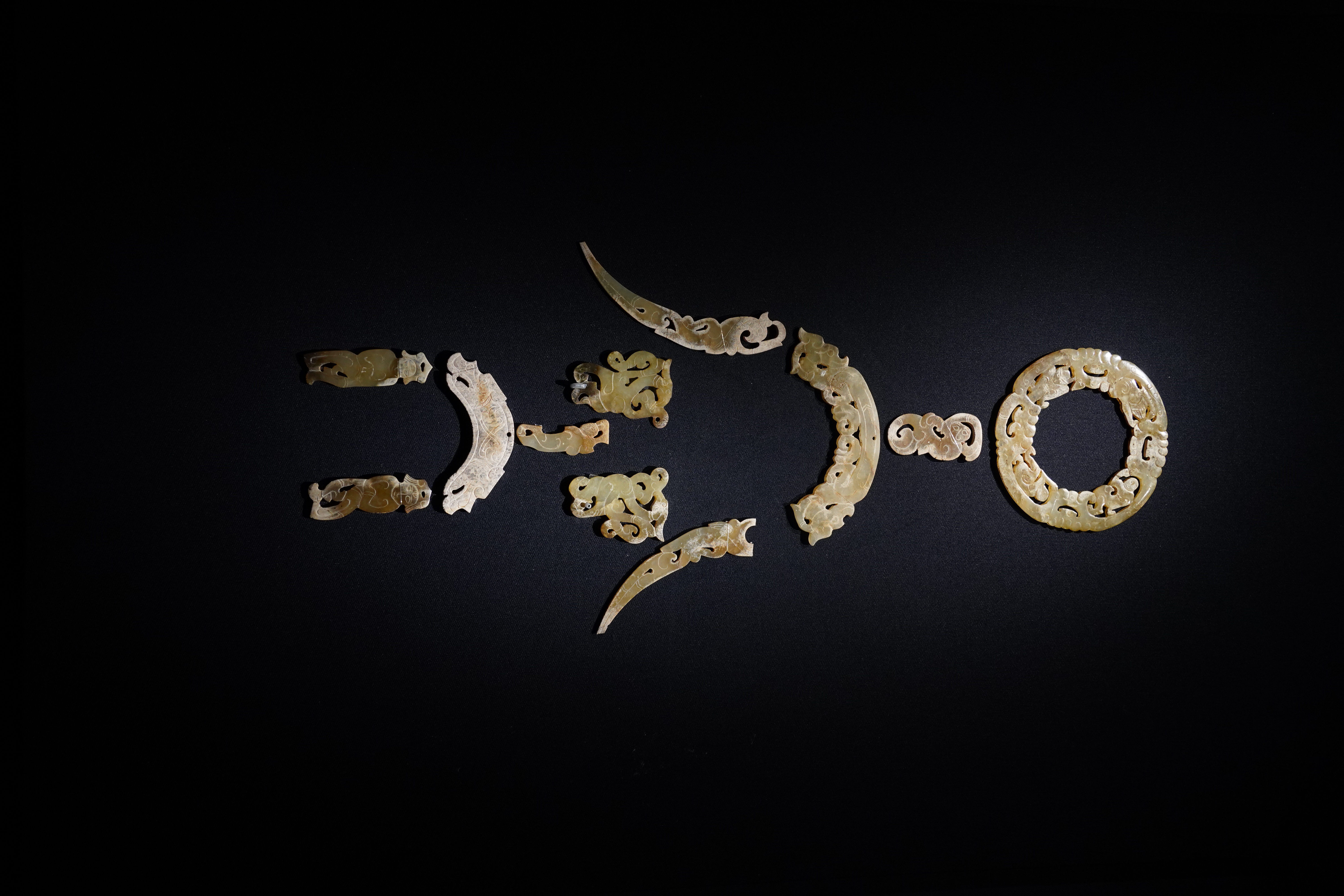 包括猴纹熊纹玉环、玉舞人、回首双龙连体玉珩、玉觽、玉舞人、凤鸟玉佩、双龙首玉珩、玉舞人佩