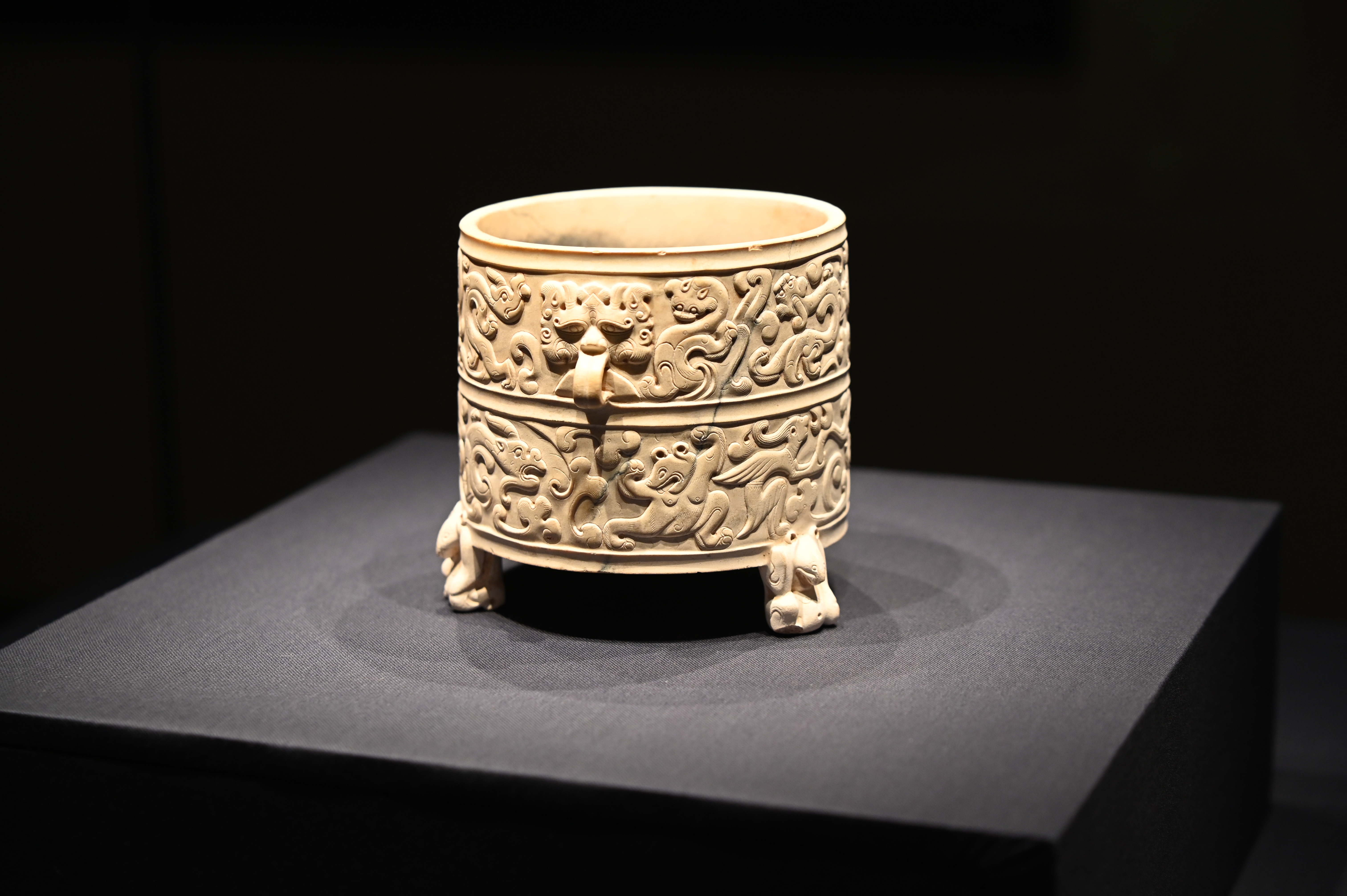 这件是,出土于西晋墓葬中,但被认为是东汉玉器。玉樽雕刻精美,四周纹饰各不相同,雕刻有10只神兽,3位仙人,3条腿为蹲着的熊造型,是汉代玉雕工艺的代表。