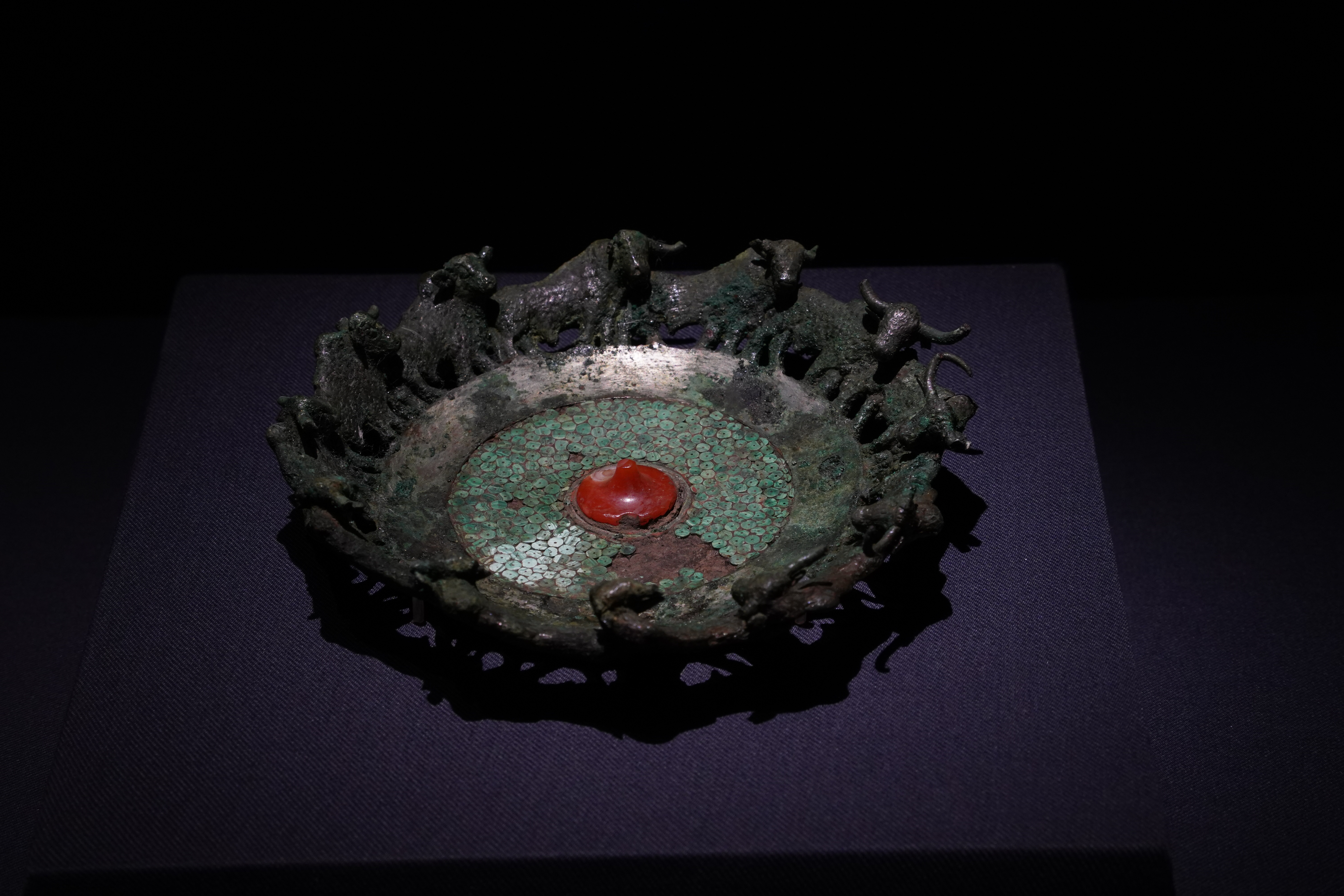 (宜子孙)西汉,嵌绿松石圆形牛边铜扣饰,出土于晋宁石寨山,云南省博物馆藏 @邹姨