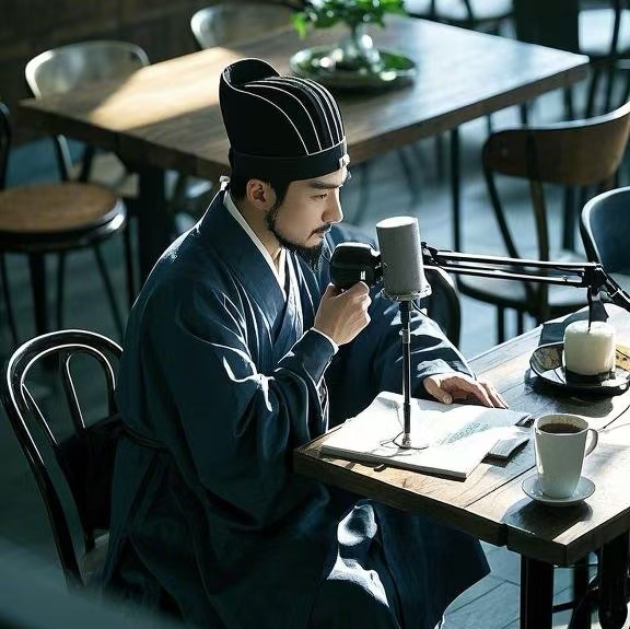 "诸位听友安好!在下复姓诸葛,单名亮,字孔明,号卧龙——不过现在得改叫‘咖啡龙’了,毕竟这黑水提神的功效,倒与我当年草庐熬夜写《出师表》时喝的浓茶有异曲同工之妙47。