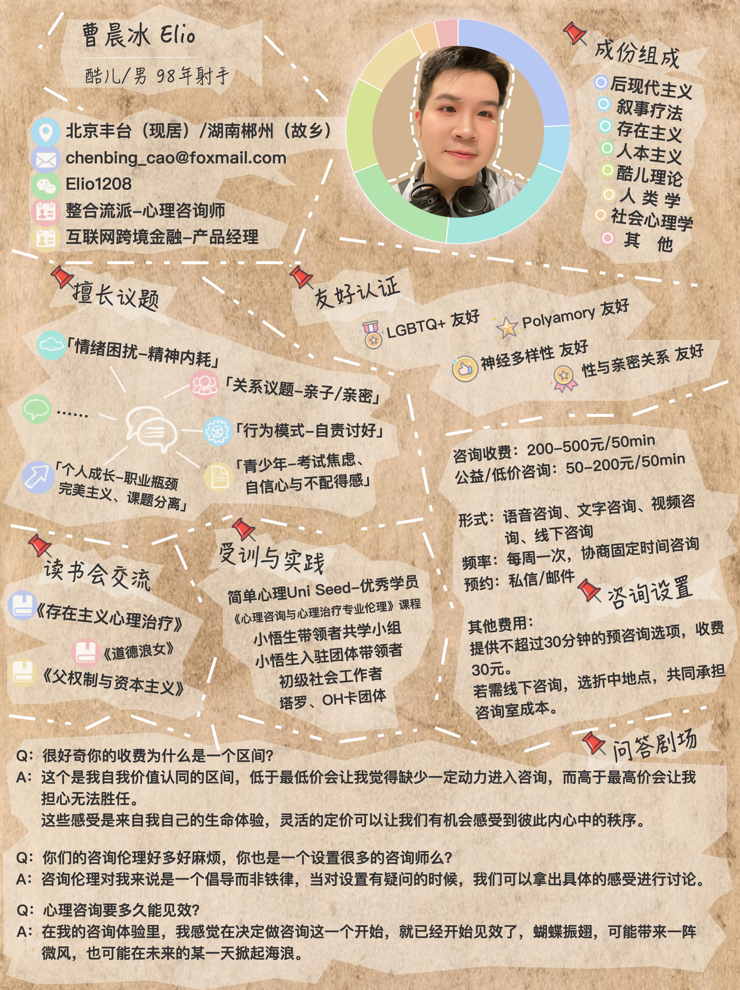 冰冰:Hello 大家好,今天我用于行走江湖的名称是“冰冰”,选择扮演的身份是“新手酷儿心理咨询师”