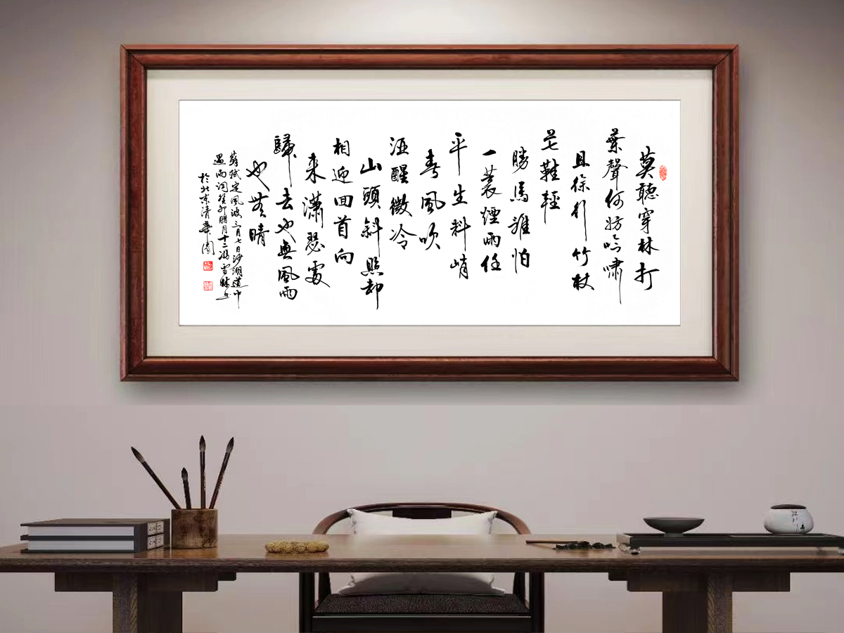 莫听穿林打叶声,何妨吟啸且徐行。竹杖芒鞋轻胜马,谁怕?一蓑烟雨任平生。