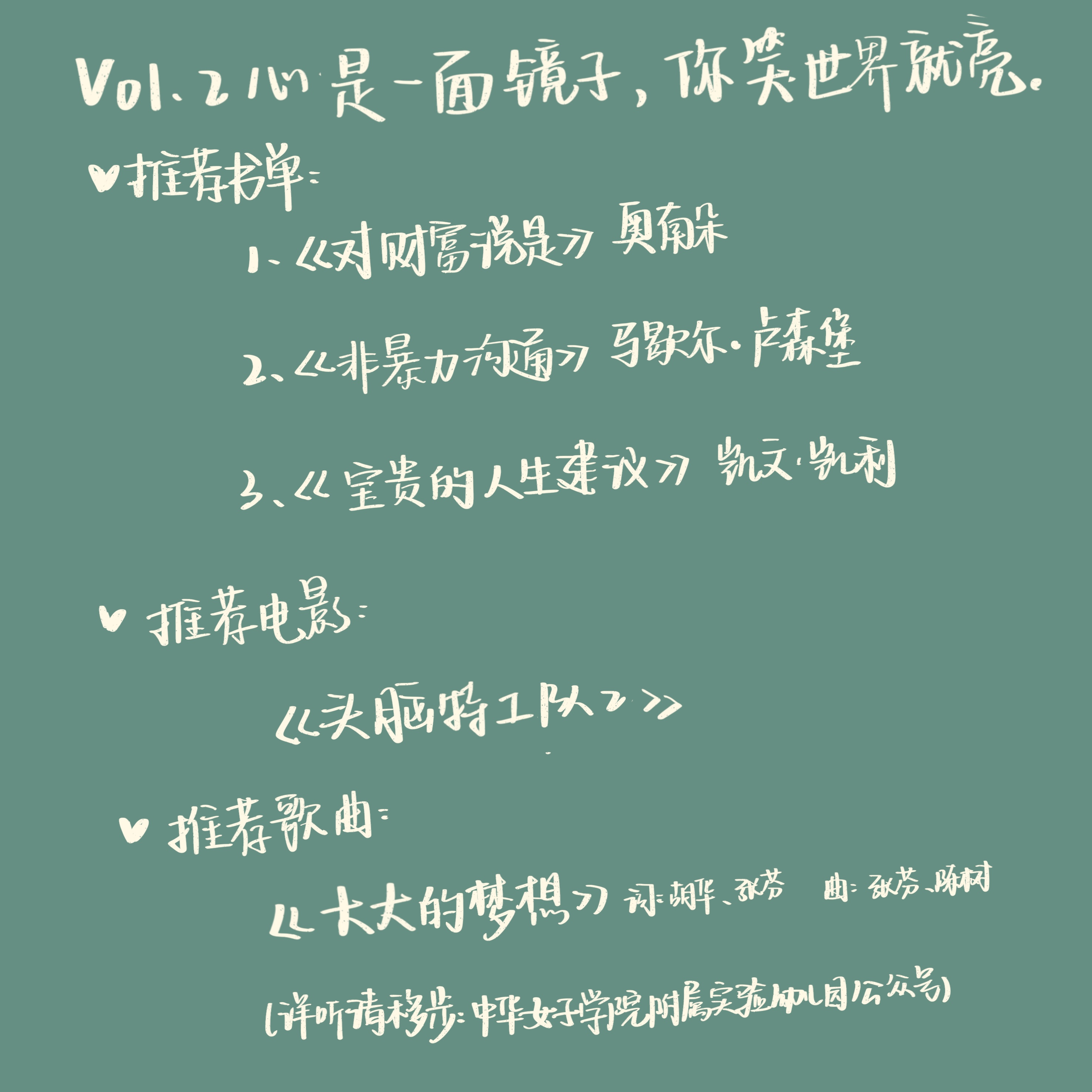 - 📖最后是书单、电影和歌曲推荐,因为歌曲可能会涉及版权问题,所以欢迎大家去公众号里听一听,小朋友们治愈的声音希望也能给每一位听众带去不一样的感受。