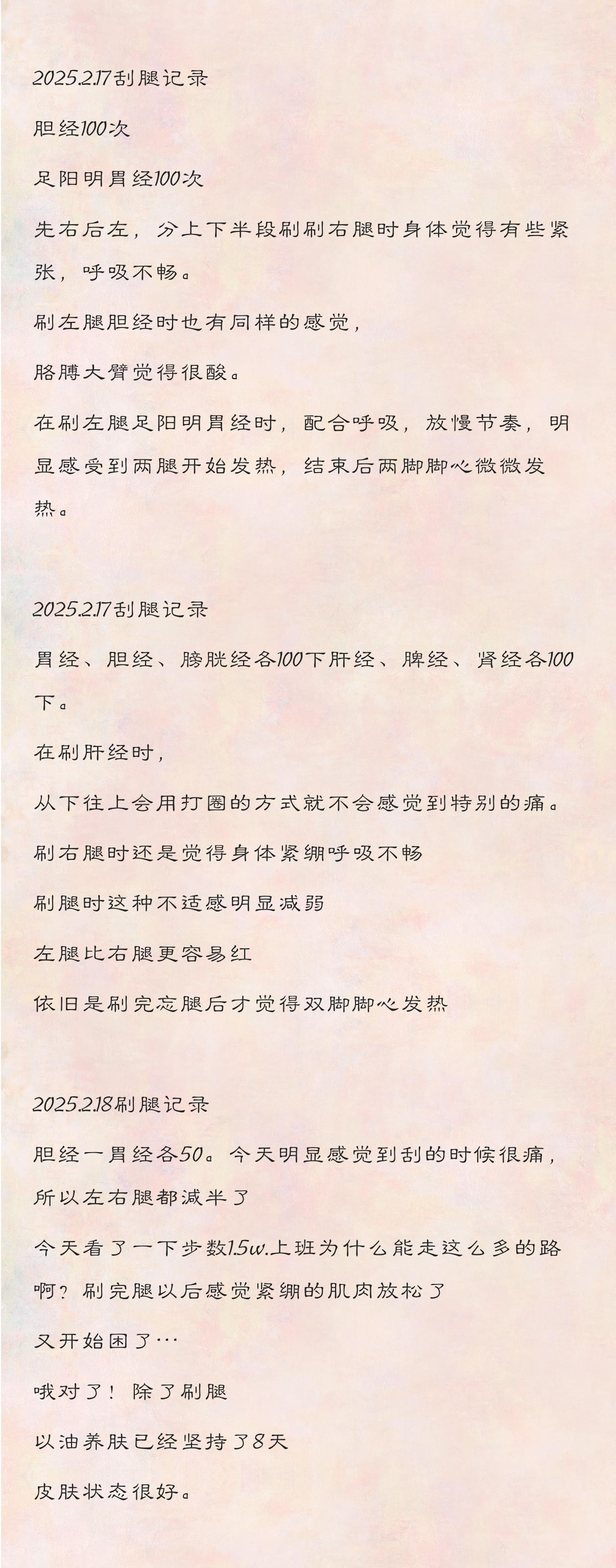 - 2.刷腿记录:爱自己的第一步就是照顾好自己的身体,不论是疏通自己的身体,还是好好护肤,还是吃饭时不看手机,都是微小而具体的每一步。