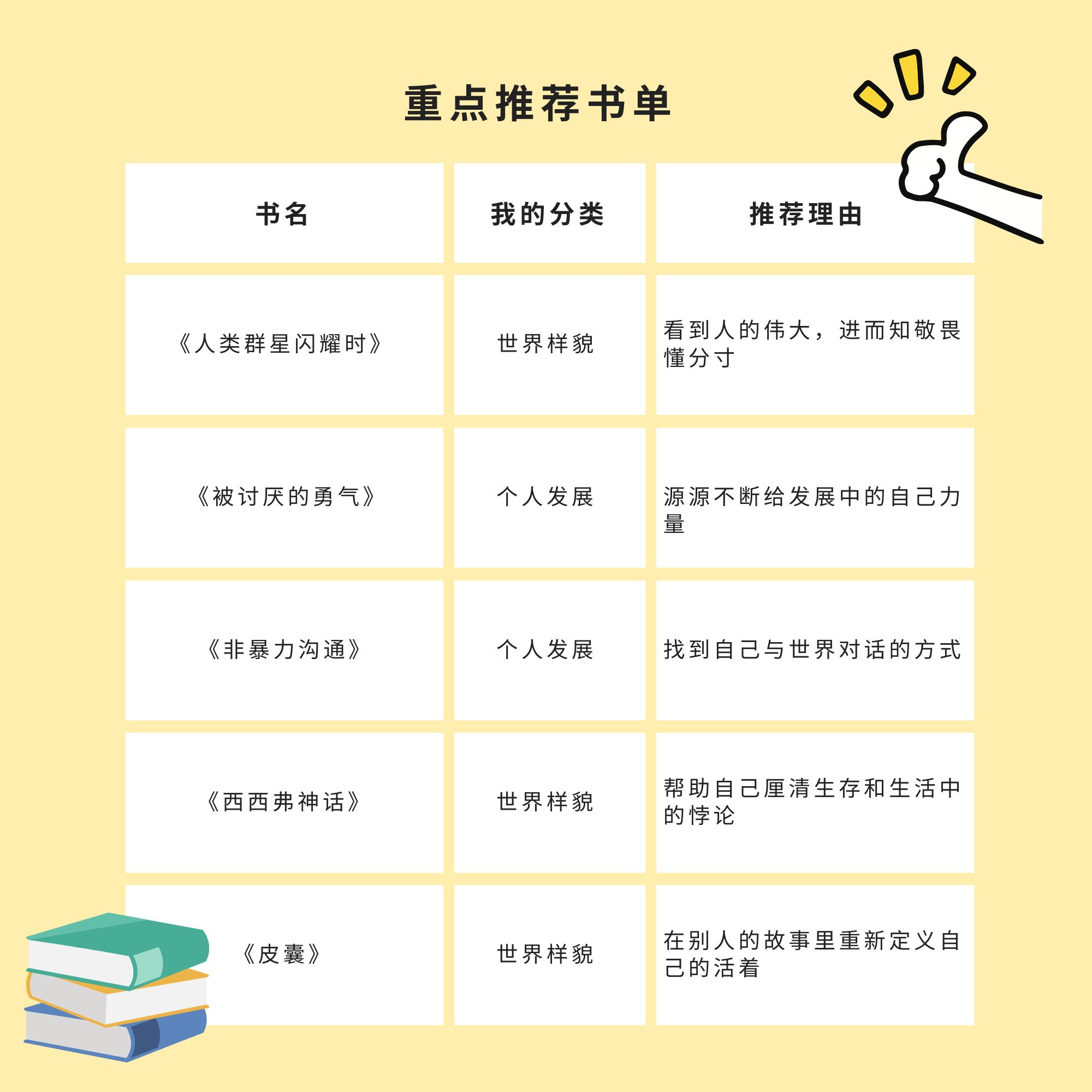 25:55推荐书单包括《人类群星闪耀时》《被讨厌的勇气》《非暴力沟通》《西西弗神话》《皮囊》,涵盖世界样貌、个人成长、沟通技巧与生命思考