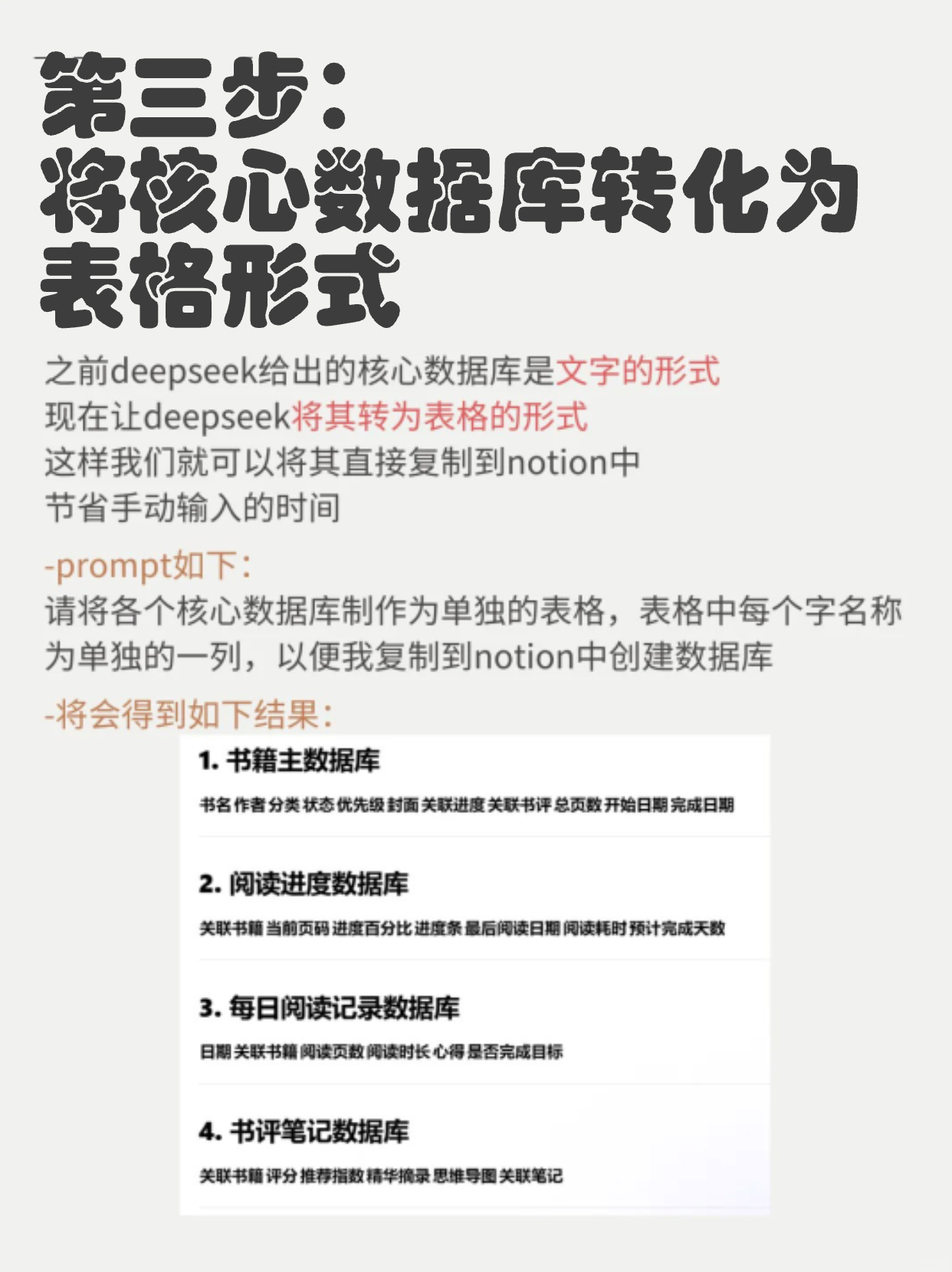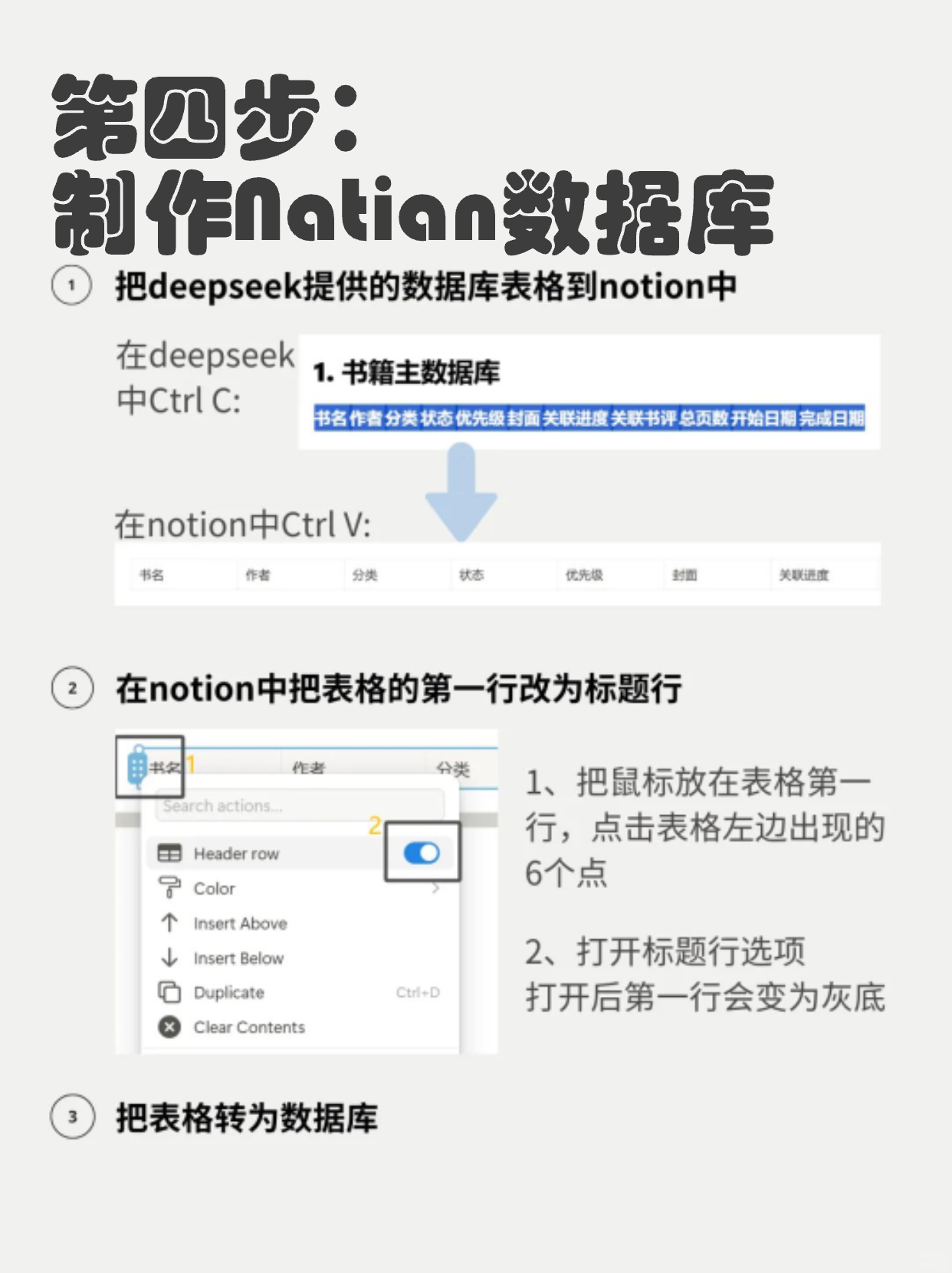 现在就可以把deepseek给出的表格复制到notion中 但转化为我们需要的数据库,还要经过一些简单的步骤 具体操作方法可以见图5的第四步。