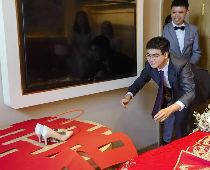 迷迭婚礼装饰借来的红色被套、游戏套圈和二手喜字。