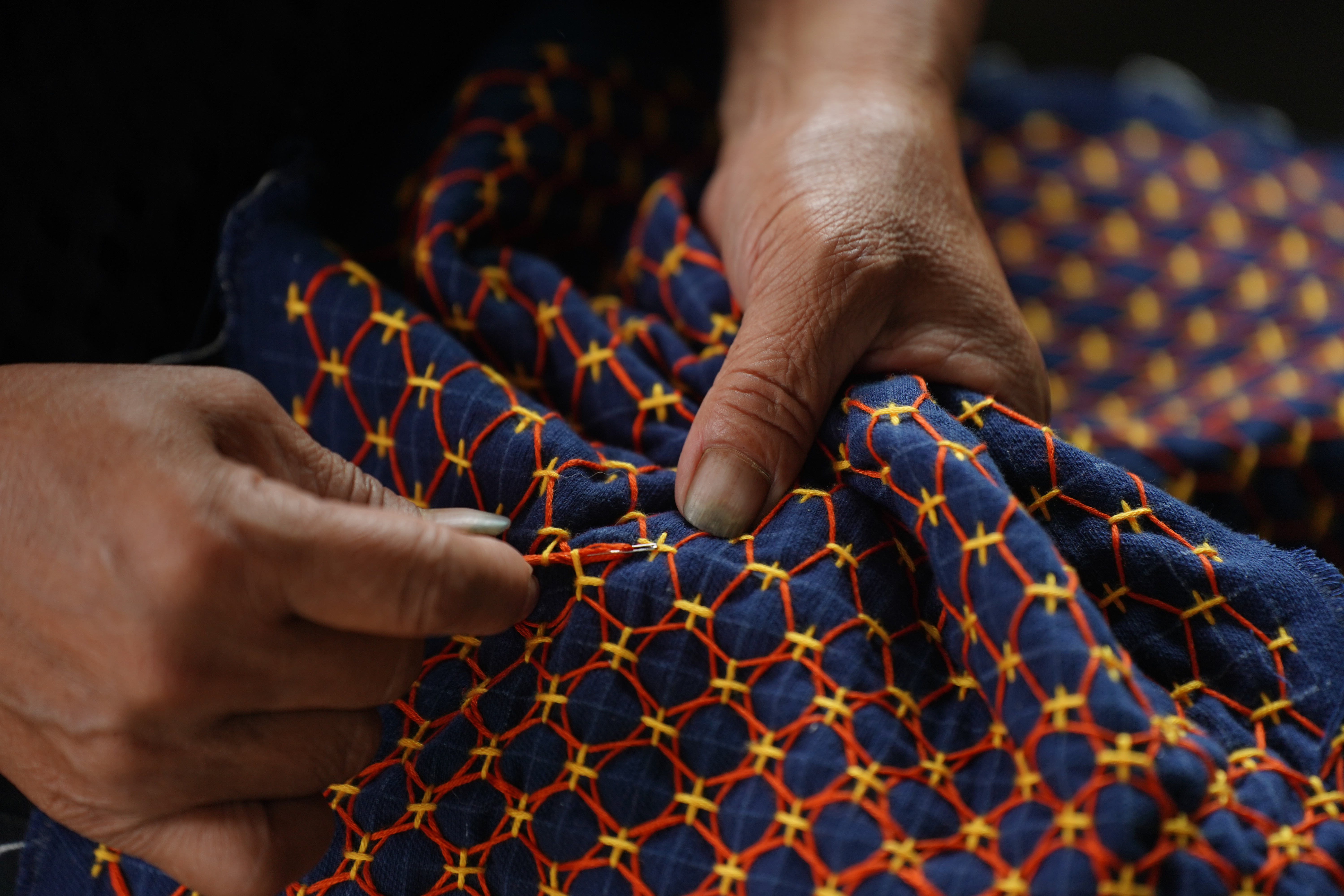 刺子绣,一种基础的手工刺绣,米粒似的细密阵脚在织物纹理之间点成虚线,简单的技法却也反映出制作者的独特性格。当传统手艺人转变角色为集体创作者,我们也不断去思考手工在现代社会中的价值所在。