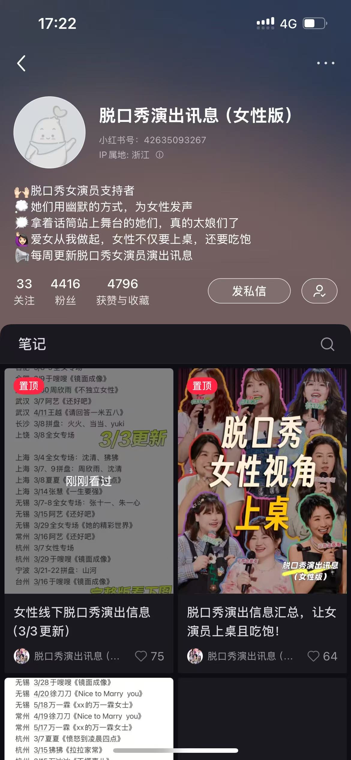 聊天中提到的女性脱口秀演员演出内容分享账号: