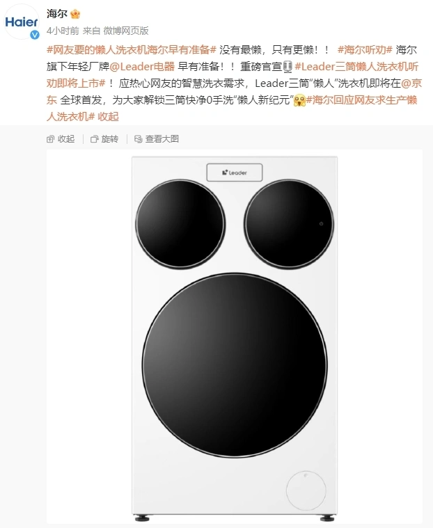 海尔听劝上市:全球首款懒人三筒洗衣机!外观神似米老鼠,网友喊话,洗头机也在安排了