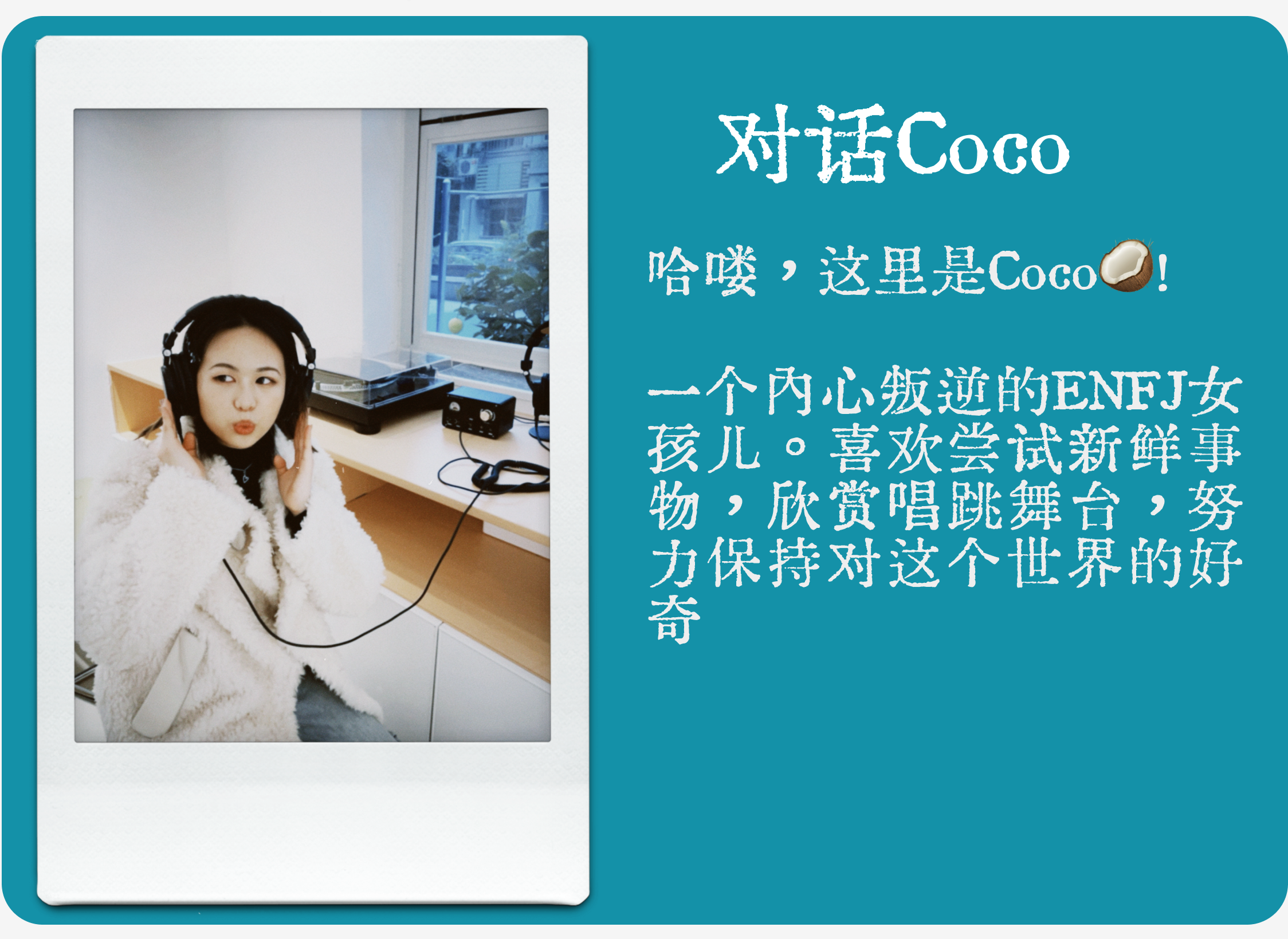 coco跟我是大学同学,我们以前总是一起出去玩,几乎每一次对我来说超越舒适圈的事情都是在coco的陪同下一起完成的!她对我来说是非常重要的朋友:)
