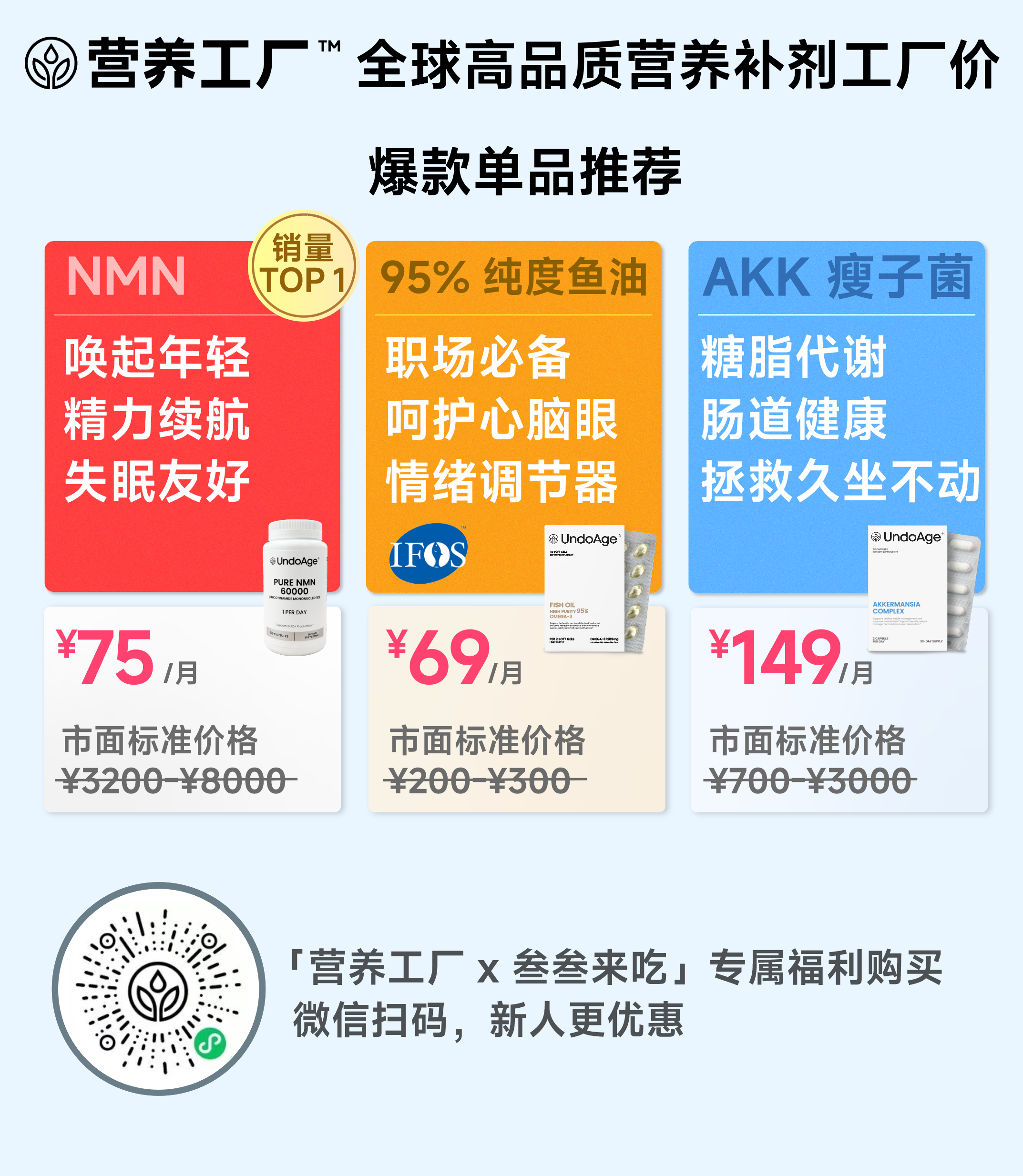 - 过了 25 岁、低能量、易疲惫——首推稳居营养工厂「销冠」的 NMN,提高 NAD+,从细胞根源延缓衰老,充沛精力,对提高睡眠质量、改善发肤甲尤其明显
