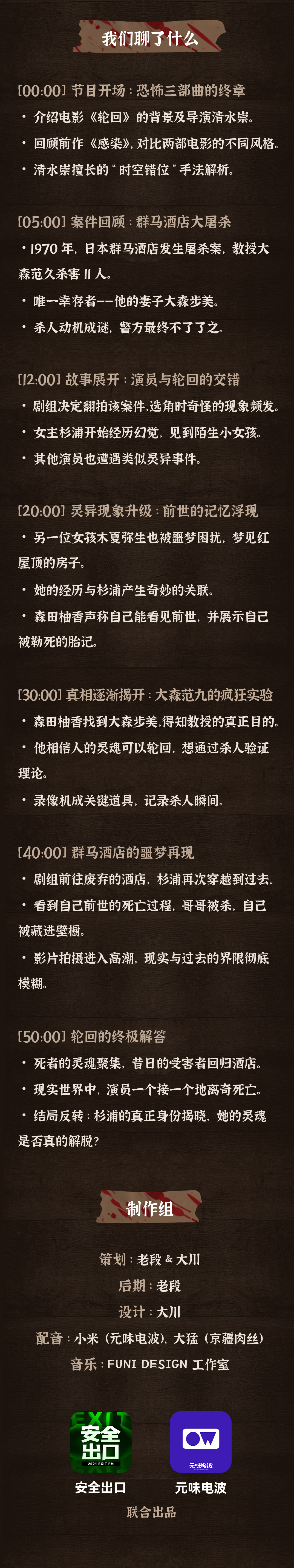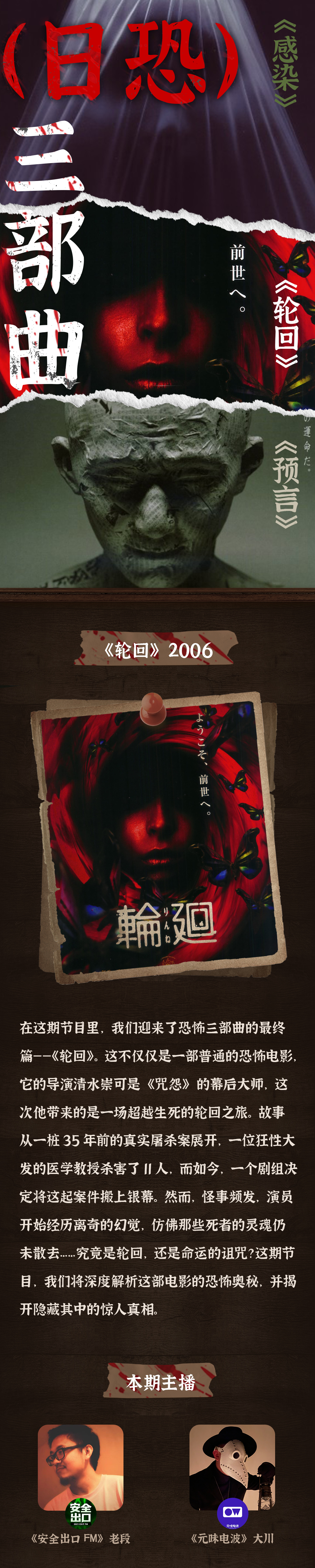 在这期节目里,我们迎来了恐怖三部曲的最终篇——《轮回》。这不仅仅是一部普通的恐怖电影,它的导演清水崇可是《咒怨》的幕后大师,这次他带来的是一场超越生死的轮回之旅。故事从一桩35年前的真实屠杀案展开,一位狂性大发的医学教授杀害了11人,而如今,一个剧组决定将这起案件搬上银幕。然而,怪事频发,演员开始经历离奇的幻觉,仿佛那些死者的灵魂仍未散去……究竟是轮回,还是命运的诅咒?这期节目,我们将深度解析这部电影的恐怖奥秘,并揭开隐藏其中的惊人真相。