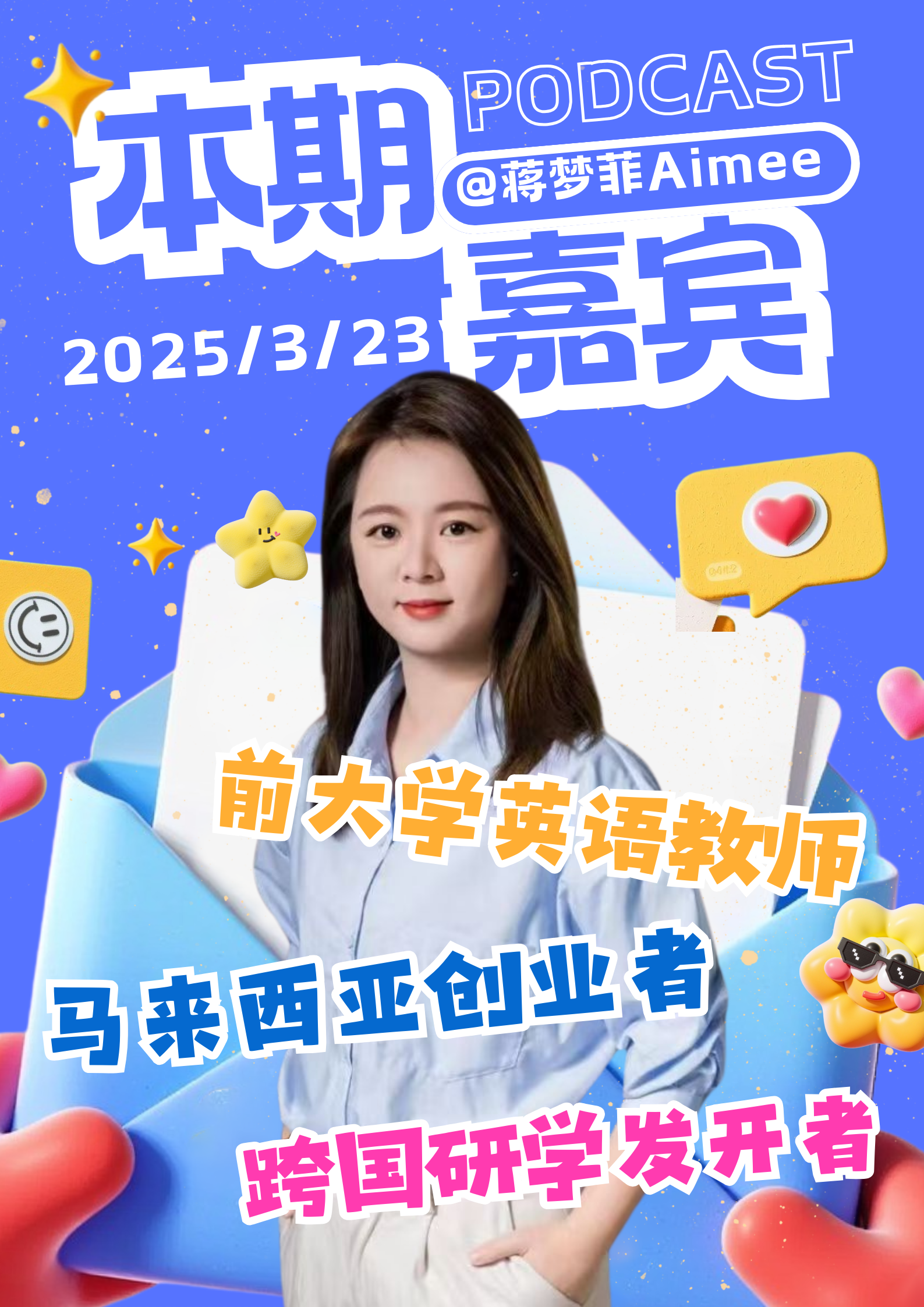 本期邀请的嘉宾是 Aimee(蒋梦菲)🎉,她曾是一名大学英语教师,现居马来西亚,转型为创业者 / 生意人💼。在成为大学老师之前,Aimee 就已经拥有非常丰富的教学经验,从幼儿到青少年,再到成人英语教育,从应试授课再到课外研学🎓。