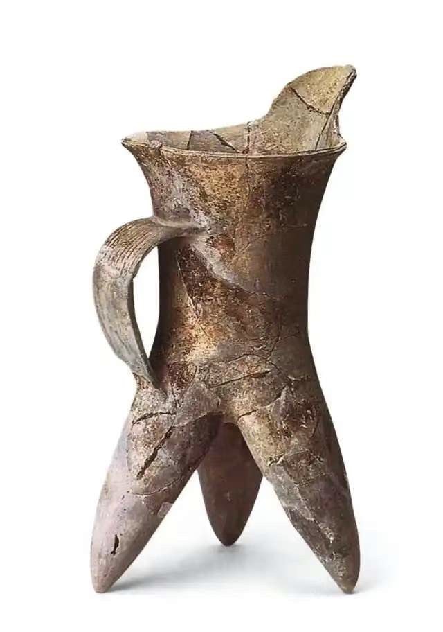 1978年二里头遗址出土。泥质黄褐陶,侈口,敞流上扬,筒形腹,下接三个细长袋足,一侧有宽扁平鋬。陶鬹与陶盉是龙山文化的典型器物。一般将敞流的称为鬹,将管状流的称为盉。陶鬹与陶盉多数质地精良,制作精美,是铜爵等铜礼器诞生之前陶礼器的核心器类。