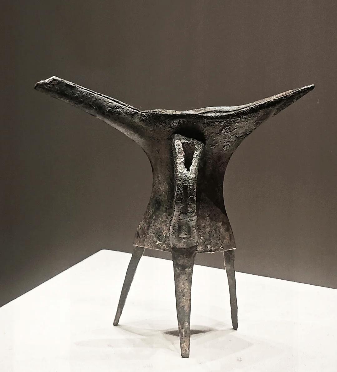 乳钉纹铜爵于1975年出土,通高22.5厘米,流至尾长31.5厘米,厚0.1厘米,窄长流、尖长尾、束腰、平底、三足,一侧有鋬,腹部一侧有五枚横排乳钉纹,因此得名“乳钉纹铜爵”。 该爵造型优美,宛若一位轻盈舒展、迎风而立的窈窕淑女,周身散发着俊巧清逸的气息,被誉为“中华第一爵”。