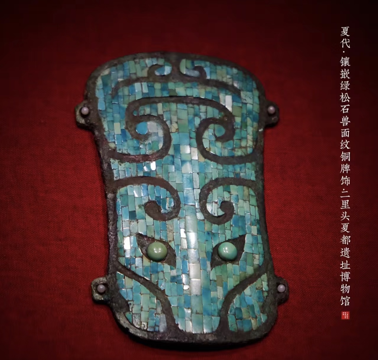 1984年秋在河南偃师二里头遗址出土。该物件通高16.5厘米,宽11厘米。为盾牌形,面微突起,它是先铸好牌形框架, 然后有数百枚方、圆或不规则的绿松石粘嵌成突目兽面。 该铜牌饰出土于墓主人的胸部,当时有可能缀于上衣之上,对于铜牌饰的功能,学界有不同的看法,有学者认为这是巫师作法的用具,也有护身符或者身份标志的观点。同墓有铜铃出土(二里头共出土三件铜牌饰,均伴有铜铃出土),在二里头文化中铜铃与铜牌饰似乎是一种固定搭配,有学者认为两者都是巫师作法时的用具,是一种沟通鬼神的法器,因为现在在萨满教中仍有操铃施法的情况。