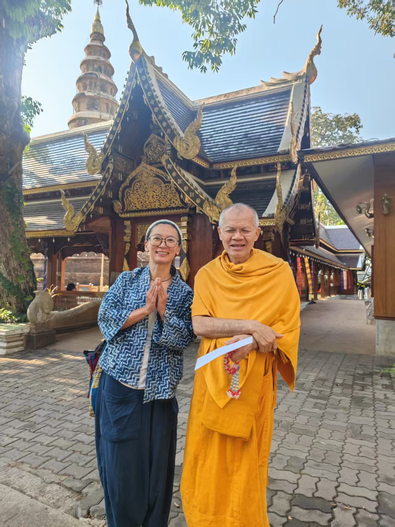 「整个人发光的勺子结束清迈十日内观训练之后与住持的合影」