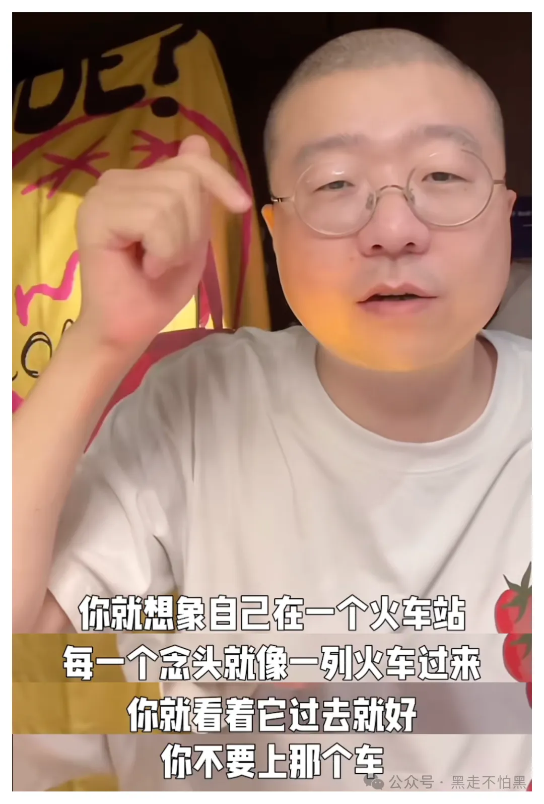 你可以对这列火车做个标记,比如我上了一班关于计划未来的火车、或者是回忆过去、分析、评判等等,然后下车,回到车站继续去观察来往的火车。