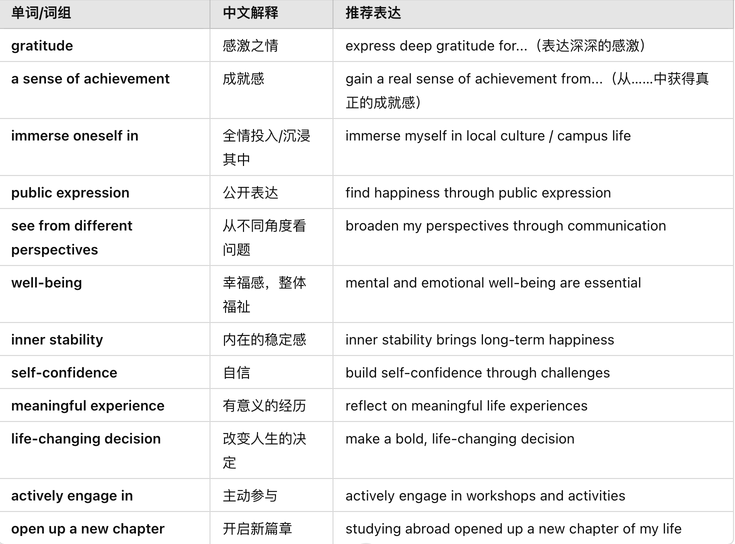 (定语从句 + as 引导的时间/原因状语) - "Looking back, I've come to feel that happiness is about what we've lived through..."