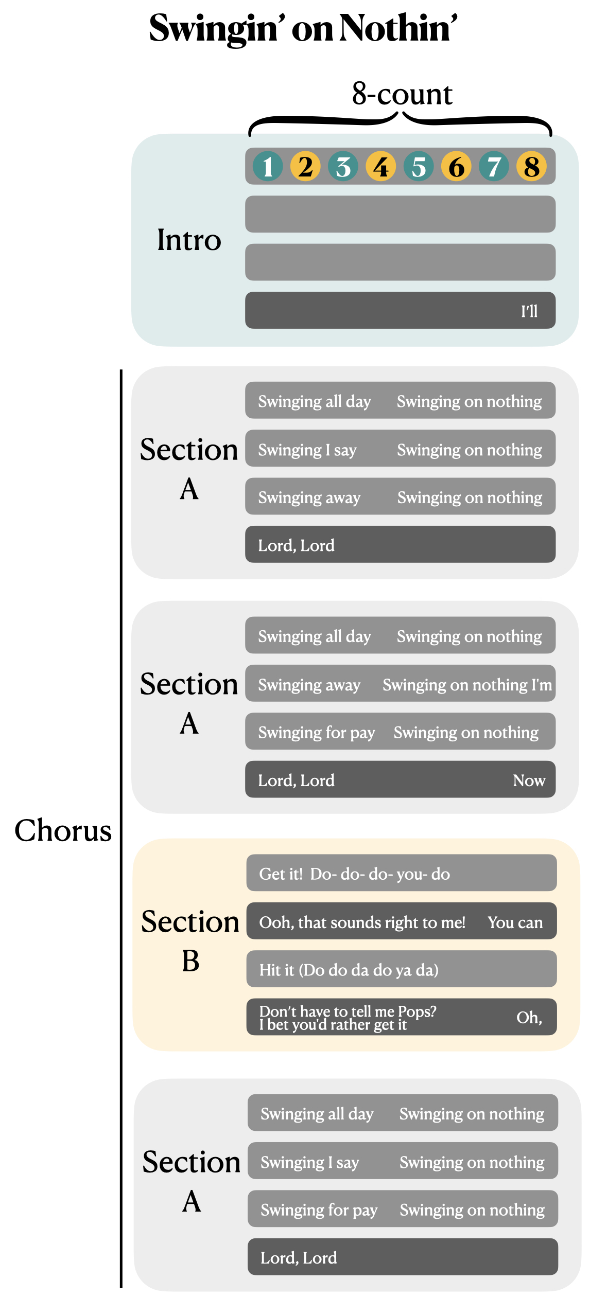 AABA Form(AABA曲式结构):Swing音乐中常见的曲式结构,常指一个Chorus,Section 1、2、4为Section A,Section 3为Section B。