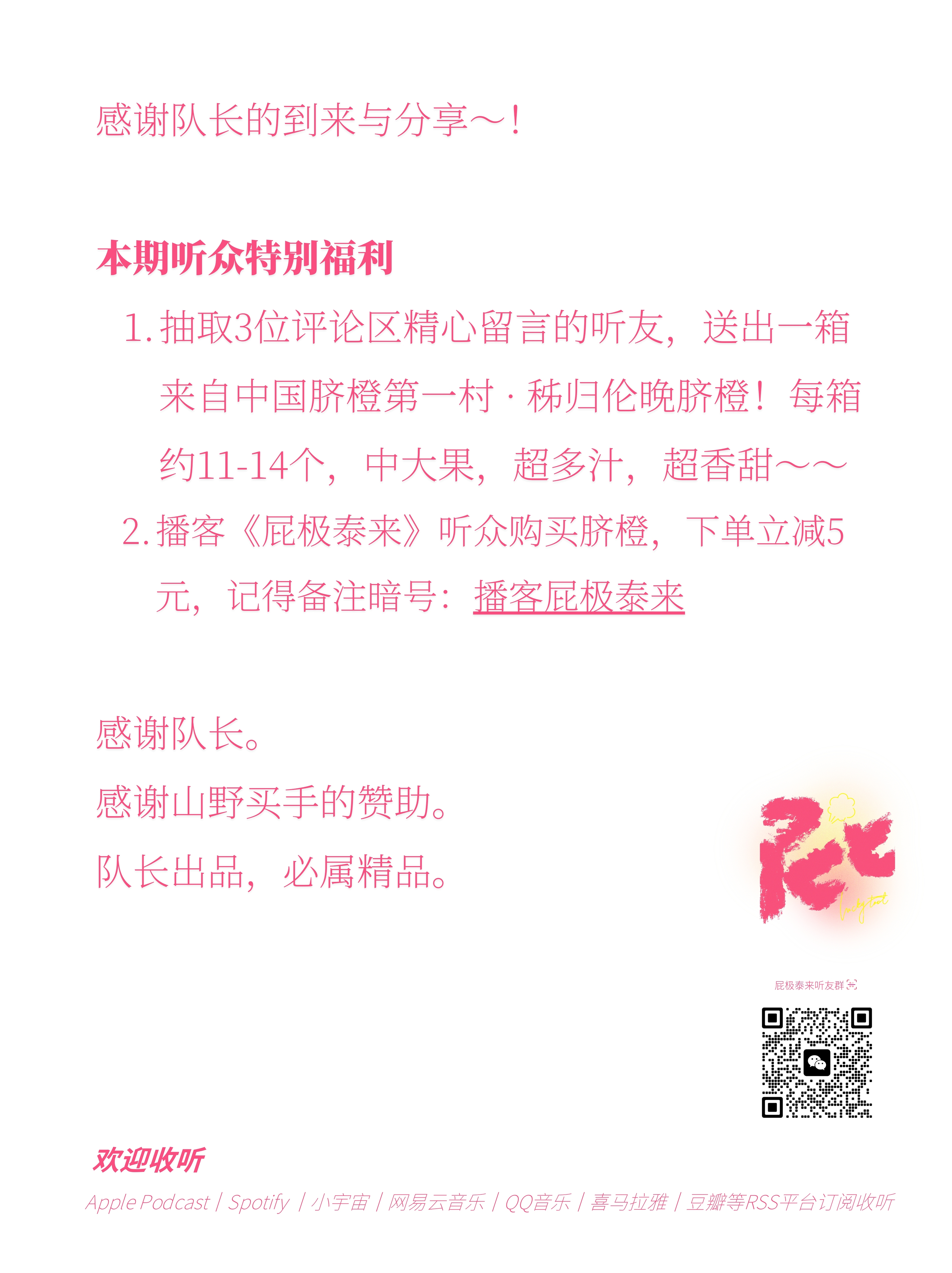 欢迎大家持续关注。慷慨的队长还为本期听众准备了礼物,我们还会在评论区抽取3位听友送出3份时令脐橙——欢迎在评论区留下你的想法!