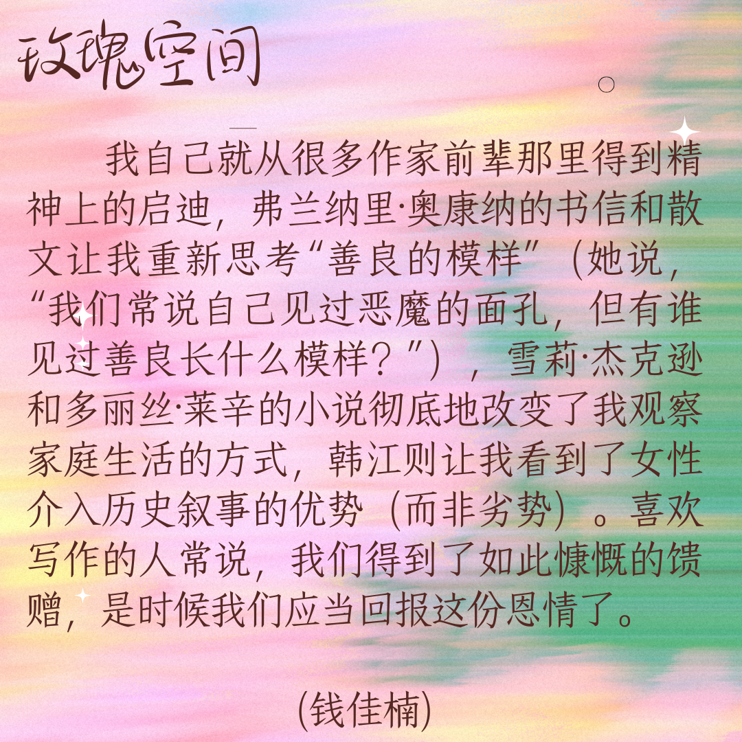 她以托妮·莫里森的名言激励年轻女性写作者:“如果你想读的书还没被写出来,那就必须由你完成。”她认为,写作是传递力量的馈赠,正如她曾从弗兰纳里·奥康纳、韩江等作家的作品中获得启迪。