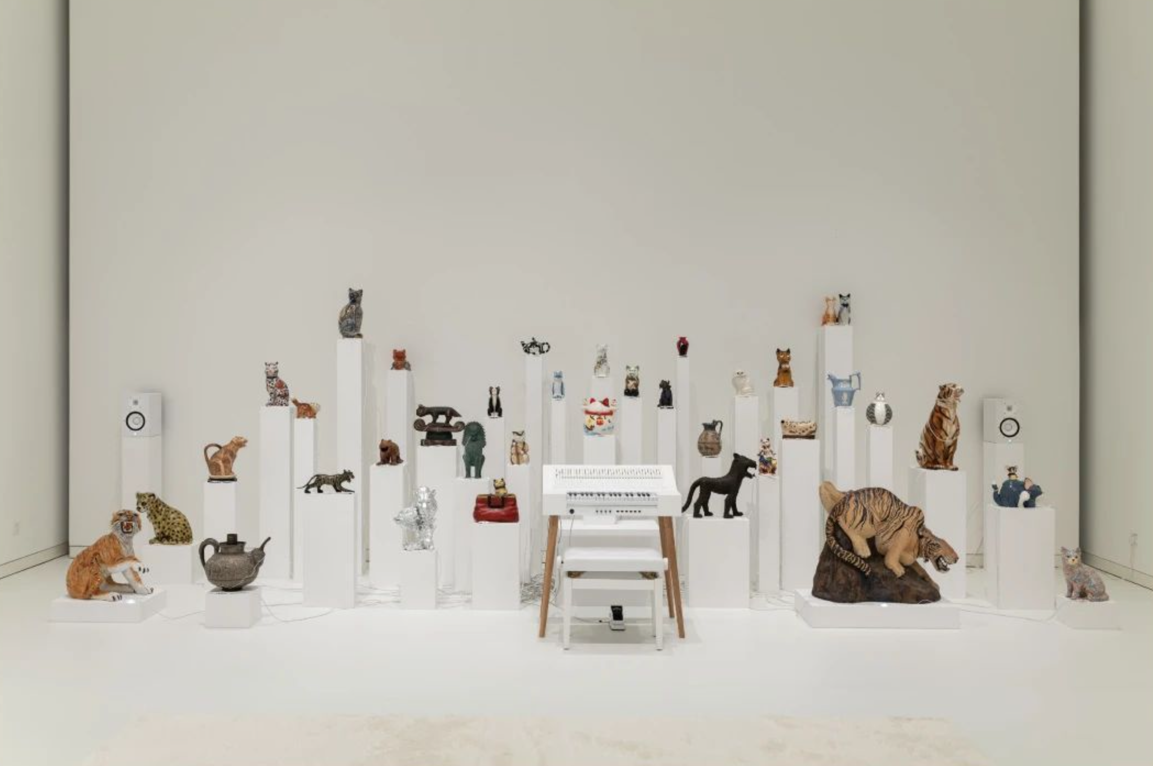奥利弗·比尔,《猫乐团》,2024年,37个猫形容器和雕塑、基座、麦克风、扬声器、音响设备,尺寸可变 ;弹奏钢琴时,后面对应琴键的猫会发出@姜六六