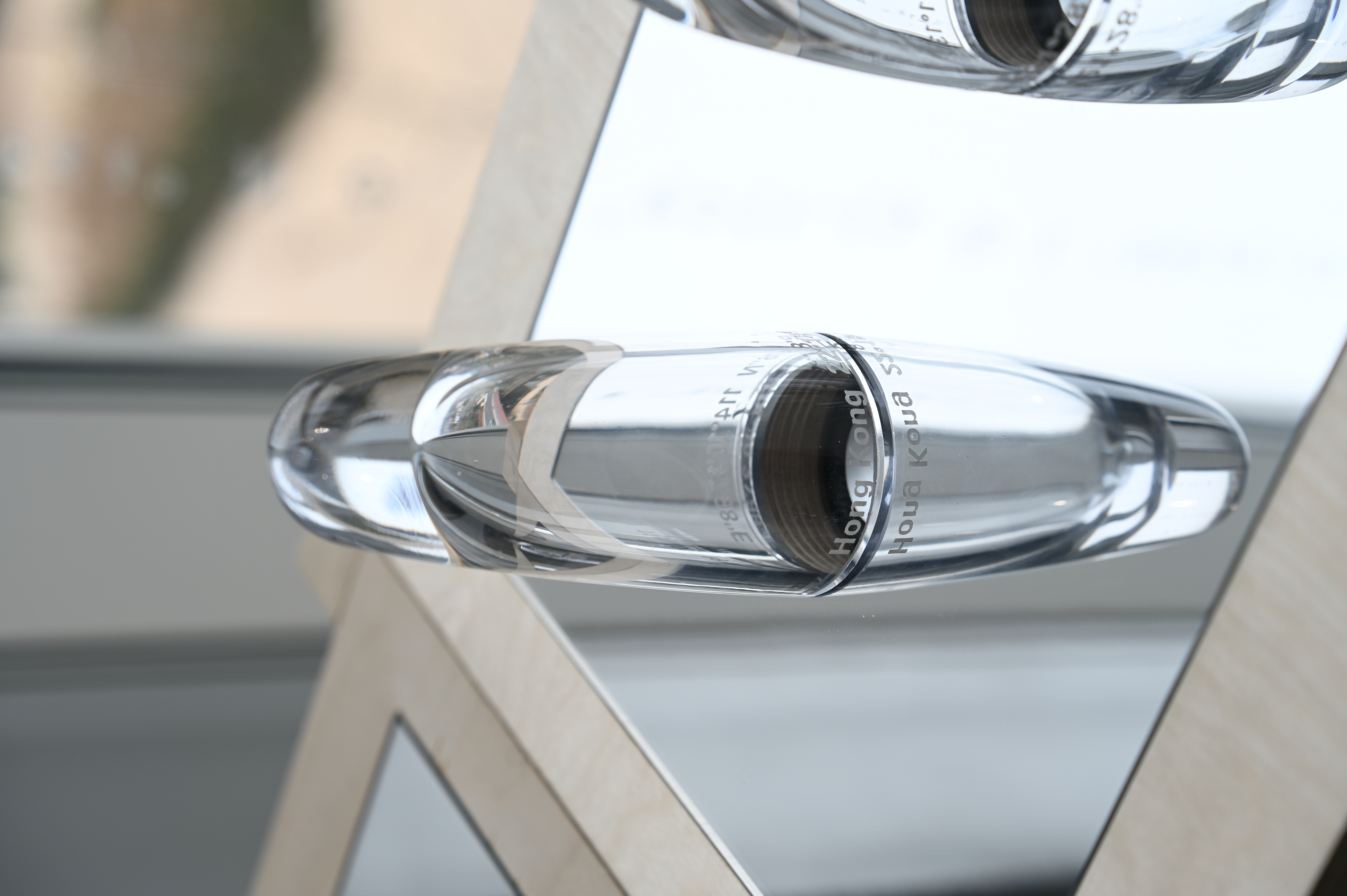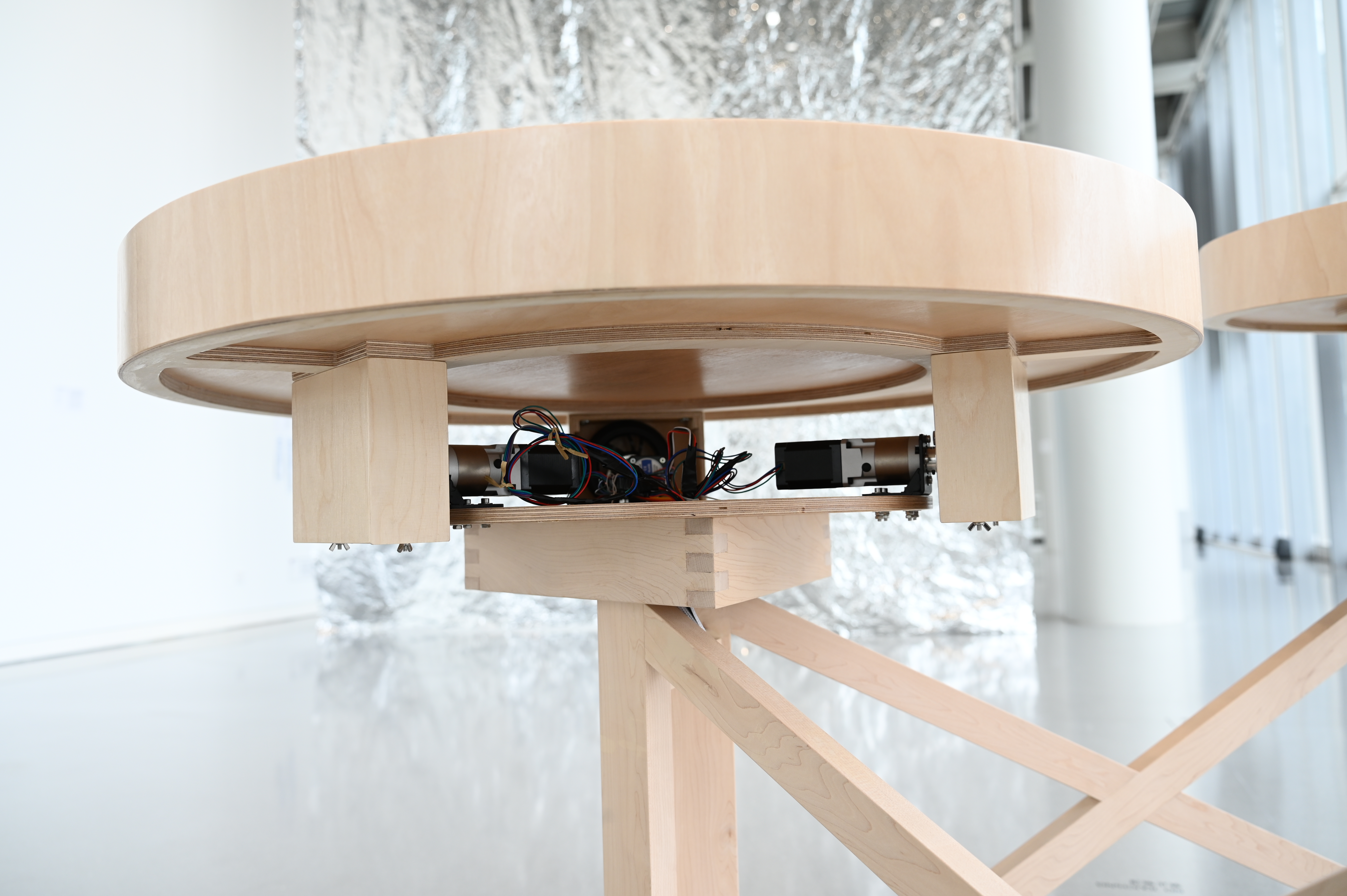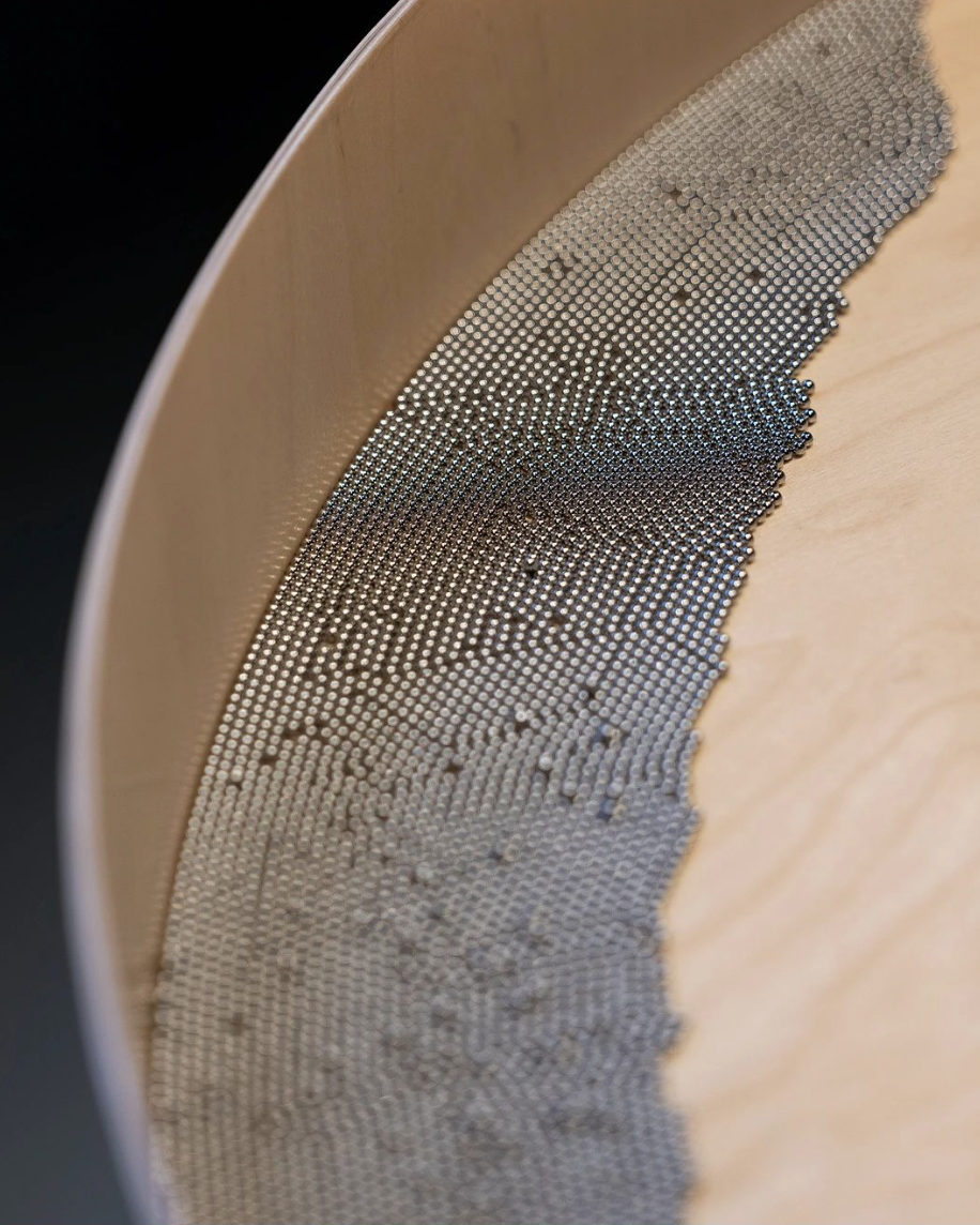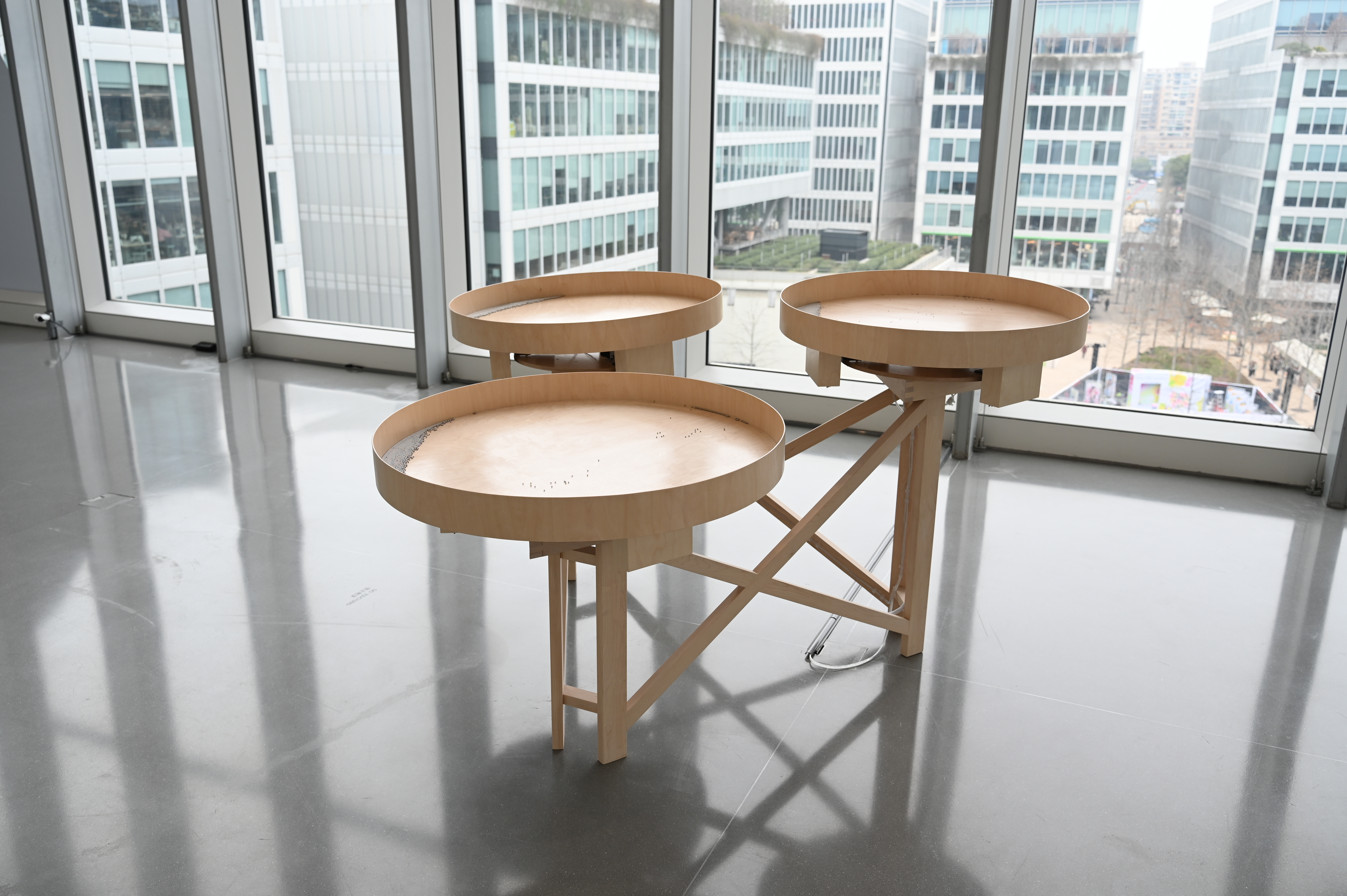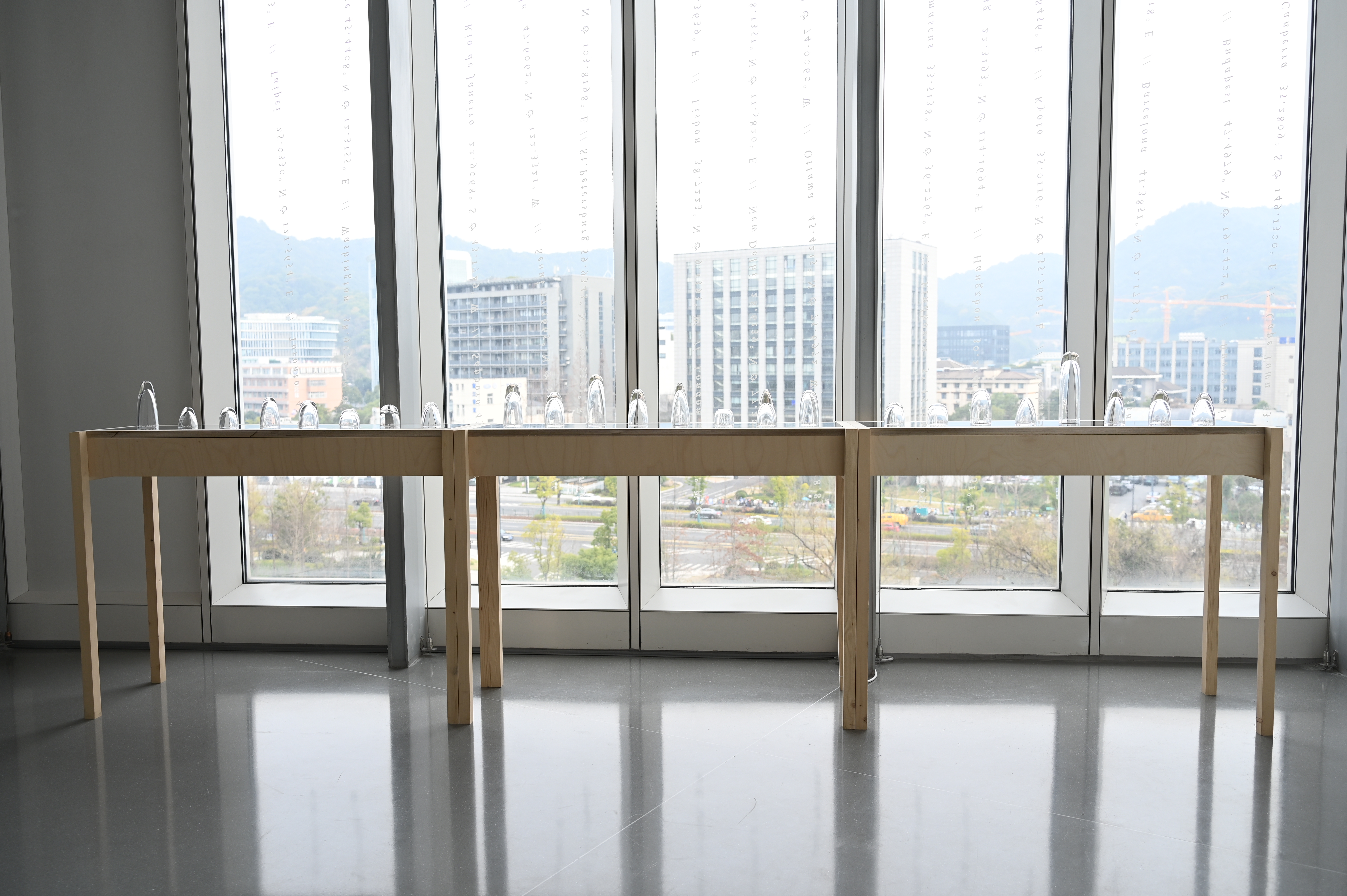 六楼展览《浮声切响》,薛雅元《下雨了》(2019-2020,艺术家惠允),介绍:声音互动装置《下雨了》联通世界各地不同城市的实时天气情况,并根据这些城市的降雨量曲线设计了相应形状的玻璃罩,在桌面上构建起一组落错的“微型几雨空间”。每当桌面传来窸窣声响,便意味着世界的某个城市开始落雨2 @场长