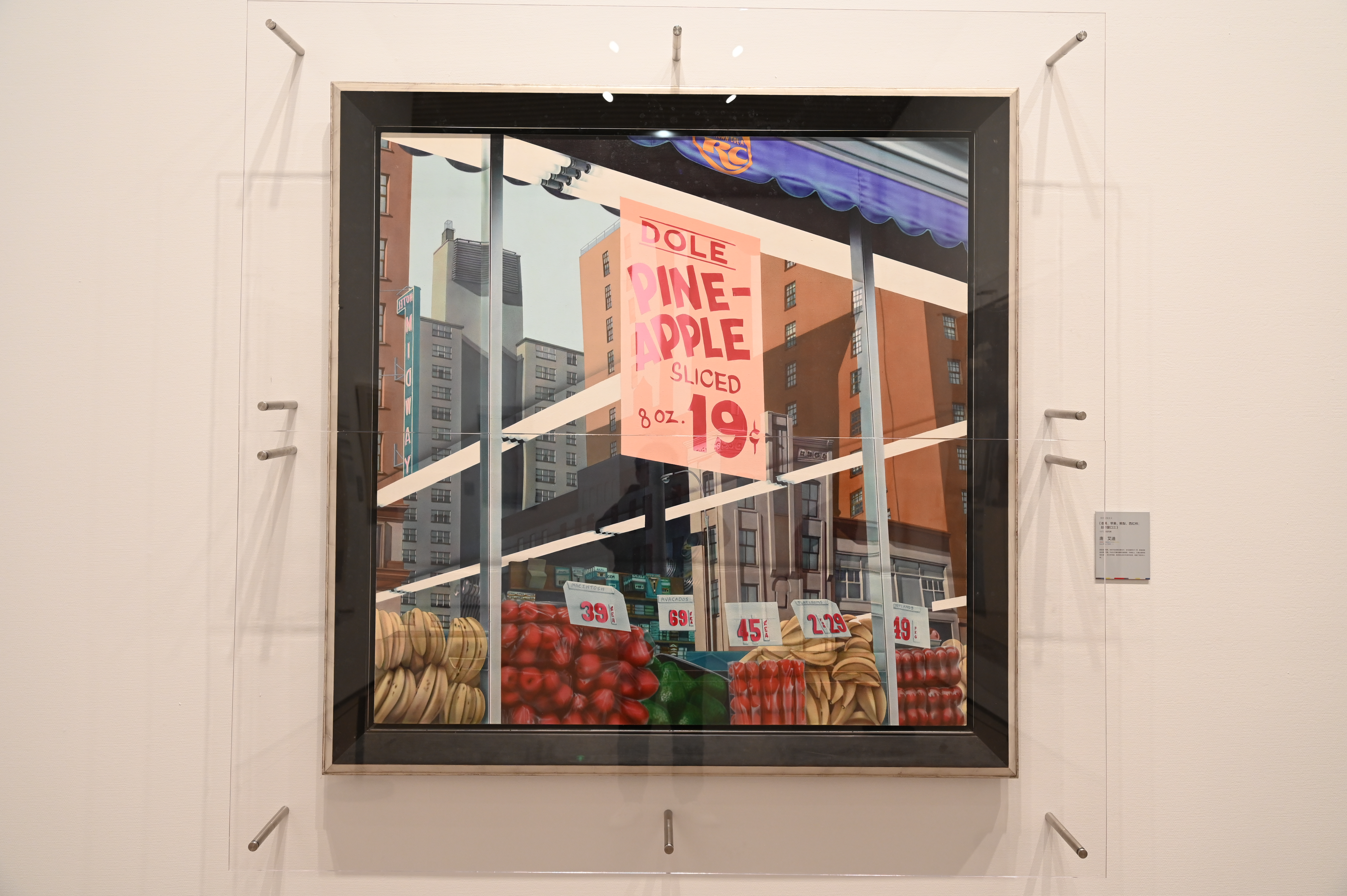 1973,唐•艾迪《香蕉、苹果、鳄梨、西红柿;超市窗口三》(布面丙烯),照相写实主义@场长