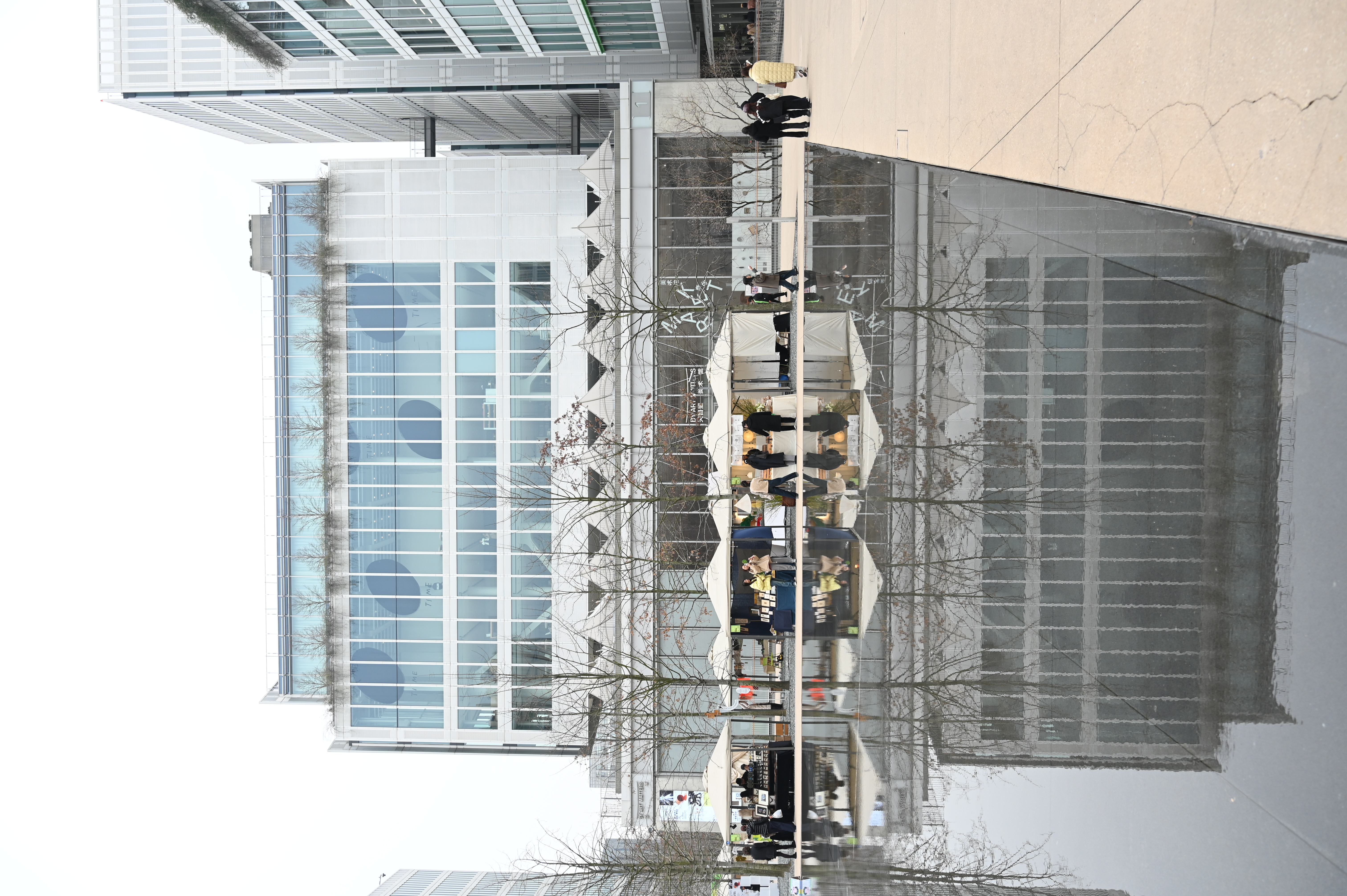 远眺美术馆,顶层玻璃上的5个圈圈为艺术家克里斯汀·孙·金作品《不止一个时间》,展示了美国手语(ASL)中表达“有时 (sometimes)”时手指划过的轨迹,艺术家借此将抽象的、不可触摸的时间具像化、复数化,让我们能够想象时间的轻盈感和轨迹的流动。 @场长