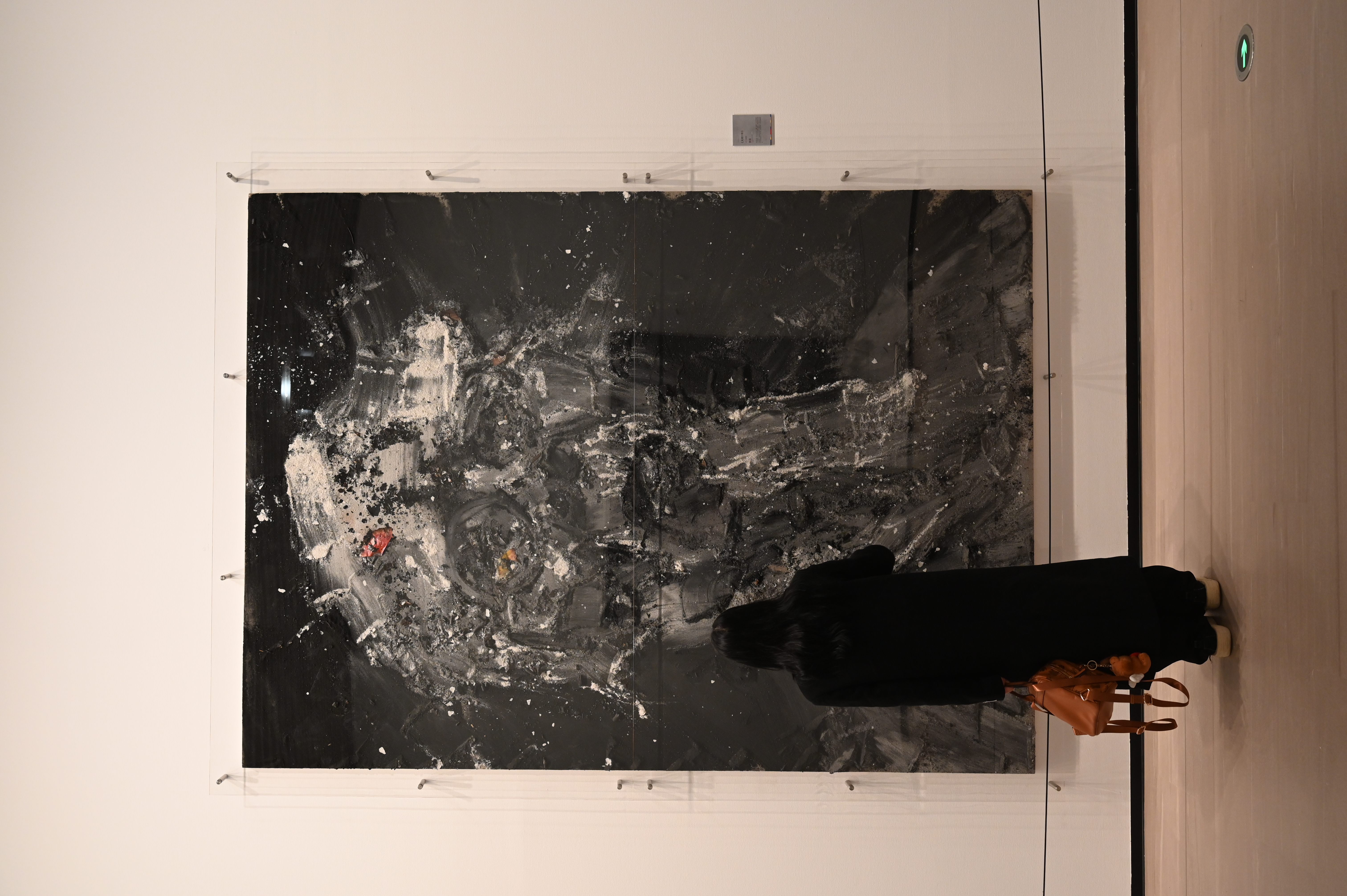 2021,张洹《大师11号》(布面香灰),中国观念艺术-展品前看展的观众@场长