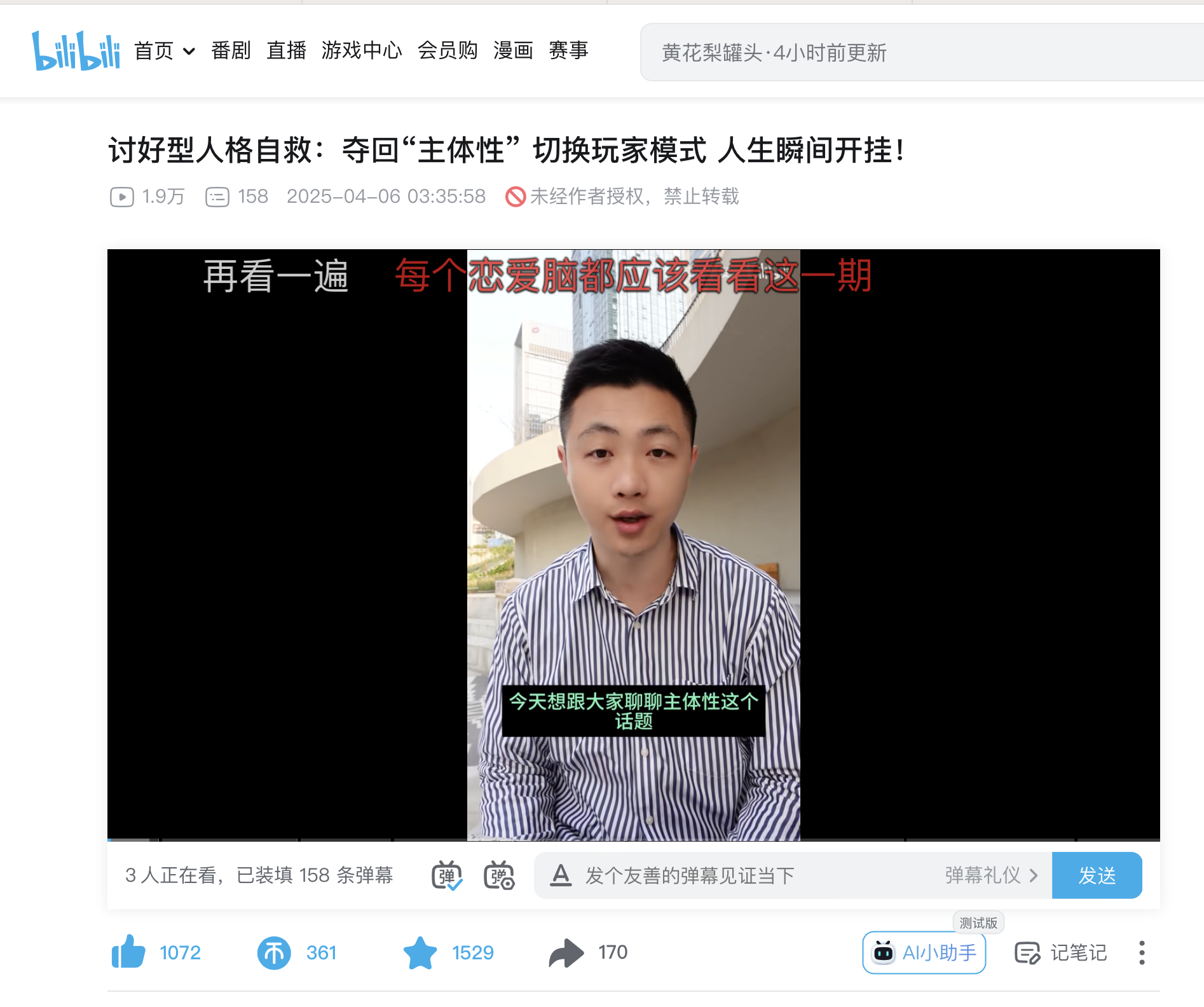 为什么你在感情里永远是工具人?夺回“主体性”:切换玩家模式 人生瞬间开挂!分享一位女性的情感困境案例,剖析缺乏主体性如何导致讨好型人格、依赖烂桃花与恐惧孤独。人生应主动掌控而非被动服务他人。孤独的本质是生命常态,珍惜“一期一会”的相遇而非占有。此外,创造性工作能唤醒自我价值。
