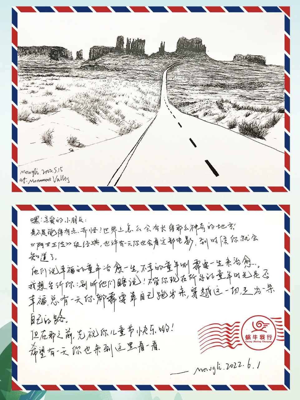 猫哥力自己画的明信片和给孩子们的寄语👇