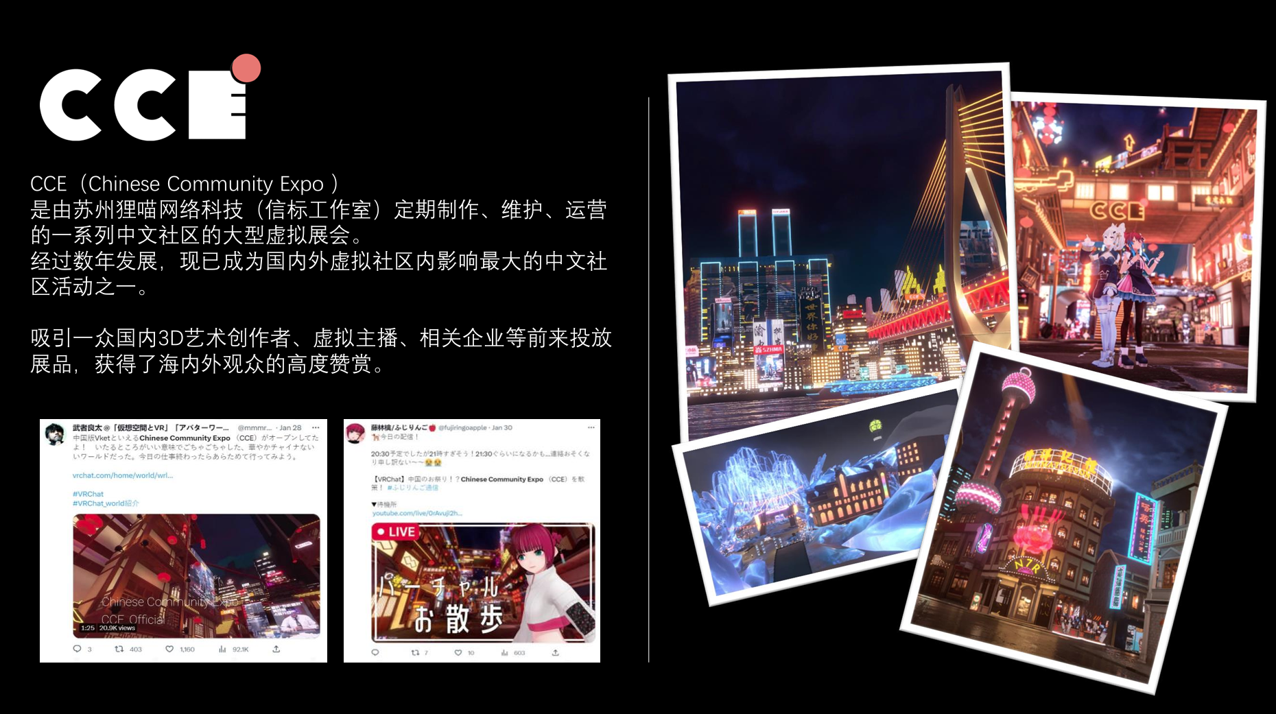 CCE(Chinese Community Expo )是由苏州狸喵网络科技(信标工作室)定期制作、维护、运营的一系列中文社区的大型虚拟展会。CCE以中国城市为原型,结合特定艺术风格进行风格化设计,制作成为虚拟场景,并以该虚拟场景作为虚拟展会的基础。通过商业合作和社区征稿,CCE可以面向VR用户(主要为VRChat用户)呈现丰富的内容,实现信息宣发、物料推广、虚拟资产展示等多种服务。