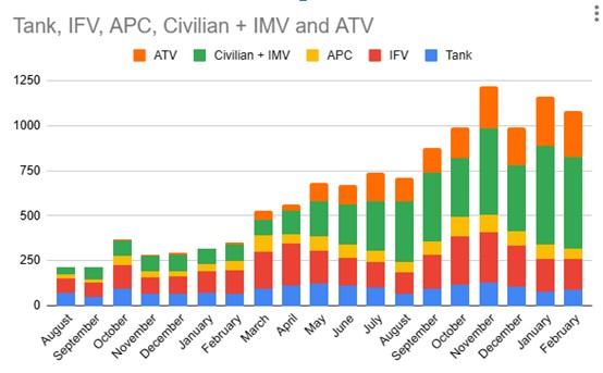 23年8月-25年2月的俄国技术装备每月损失分大类统计