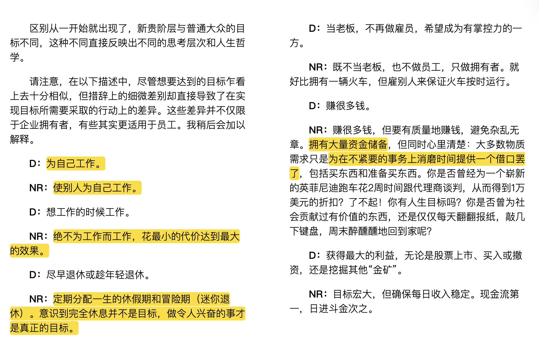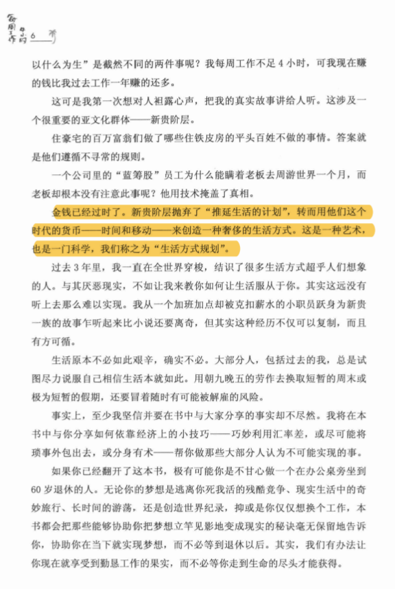 书中提出“新富族”不是指赚很多钱的人,而是拥有时间自由、地理自由和精神自由的人。目标不是积累金钱,而是最大化生活质量。