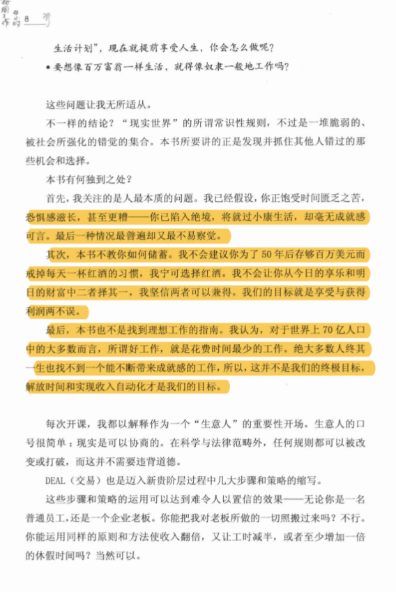 整本书在挑战一个观念:“正常工作生活方式”未必适合每个人,我们可以打破常规,为自己设计个性化的理想生活方式。