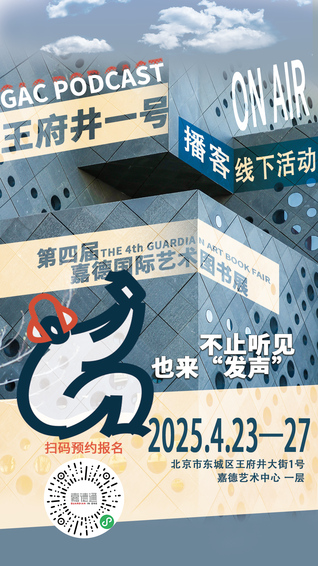 - 在第四届嘉德国际艺术图书展期间《王府井一号》将首次开展线下活动,特别推出“播客开放麦”主题互动活动,邀请听众走进播客的世界,体验录音、参与对话、打卡互动,让声音真正“发生”。扫描图中二维码参与活动报名