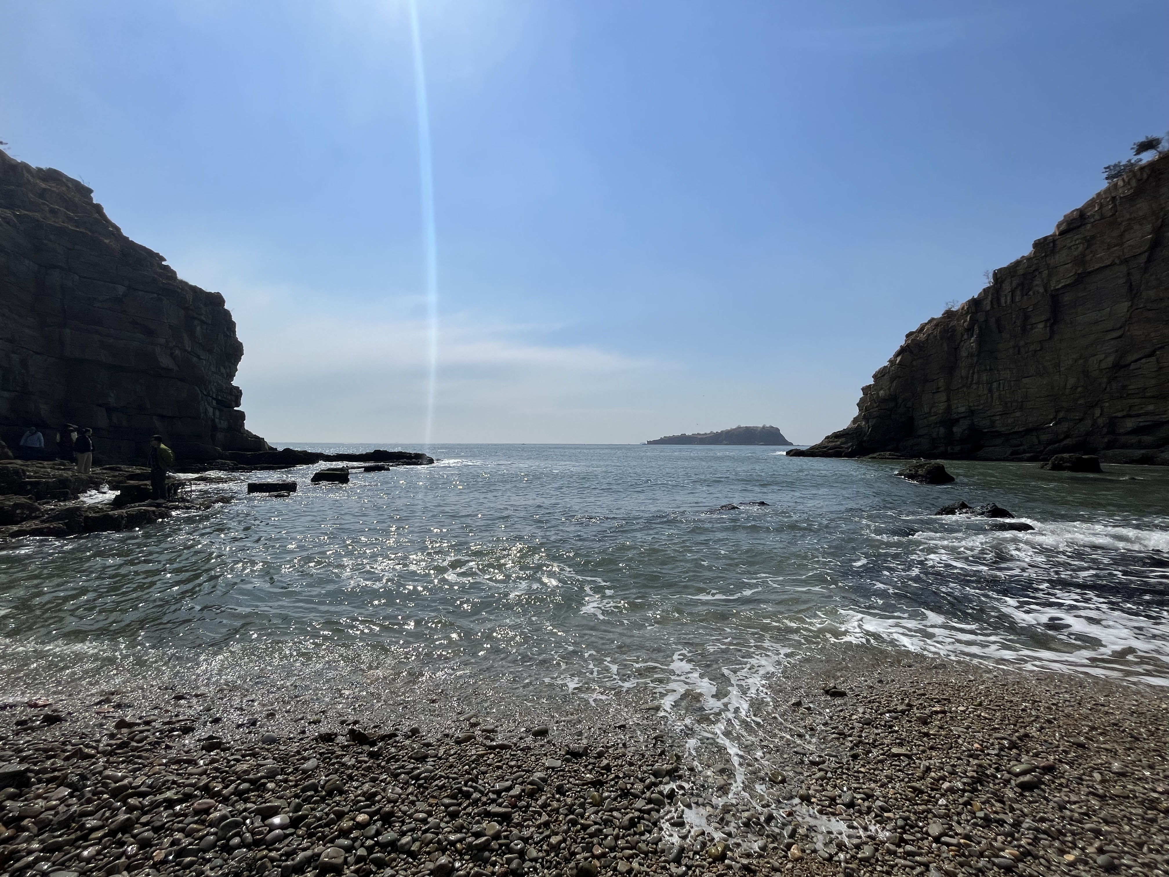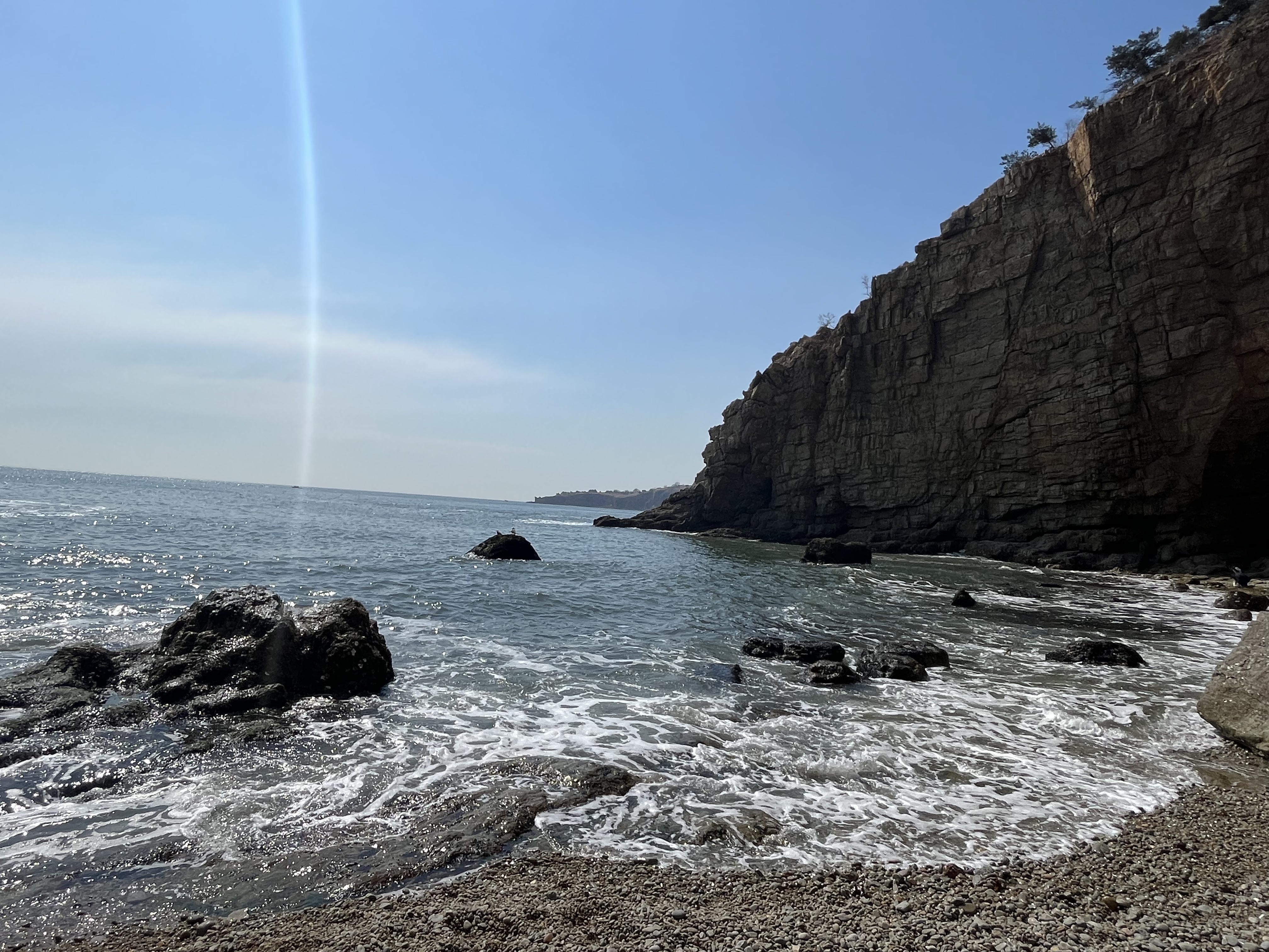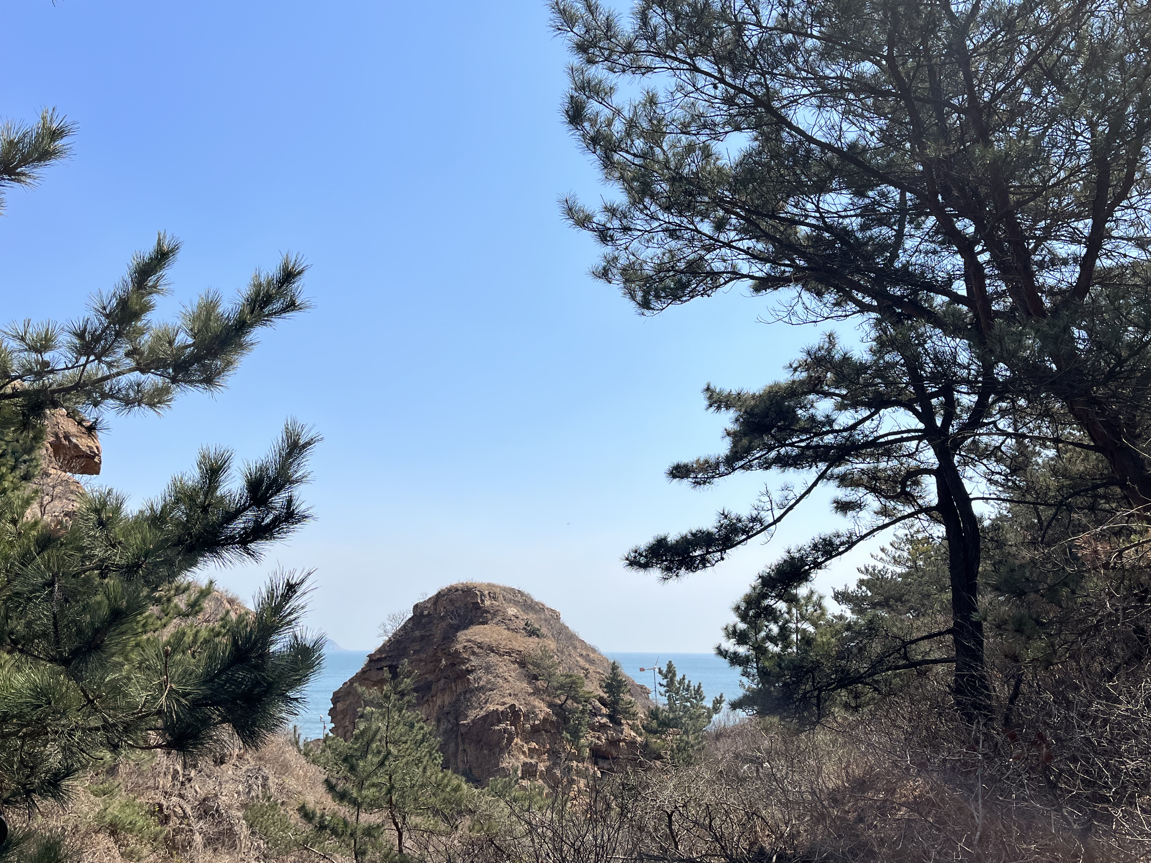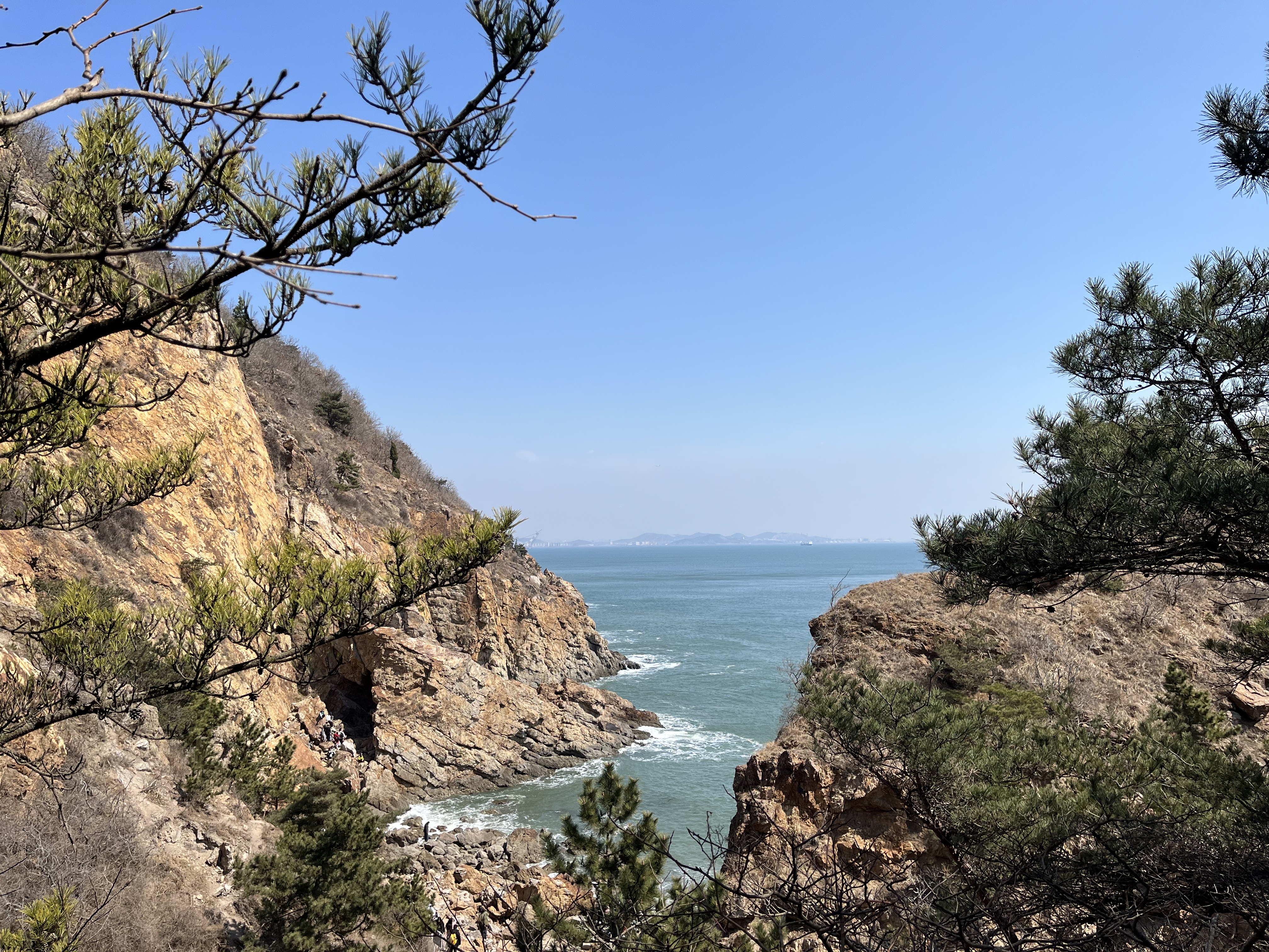 7.在半山腰的地方,抓拍到了照片,两个石头山,中间是海水,由近及远、由窄变宽地延伸着。