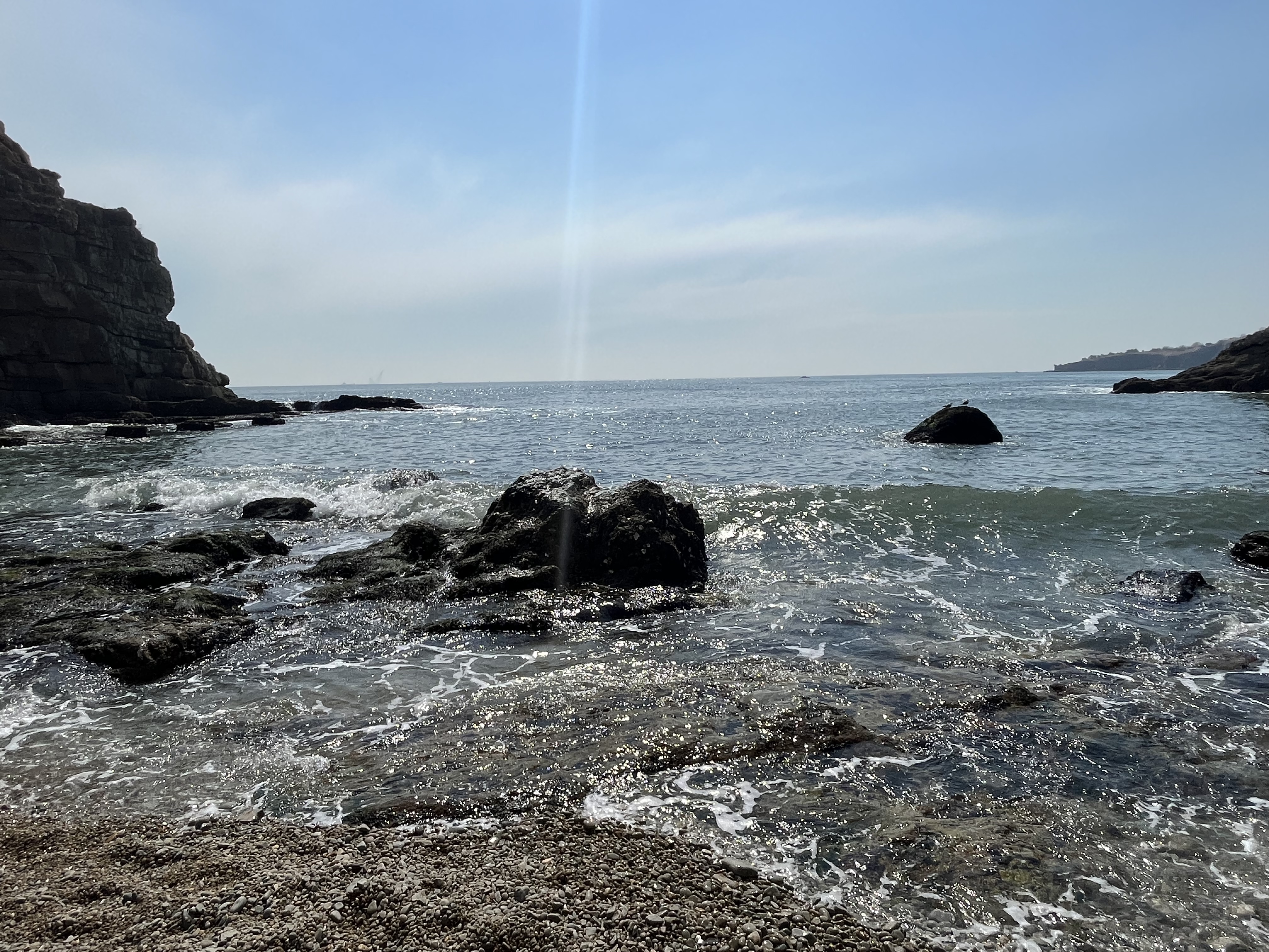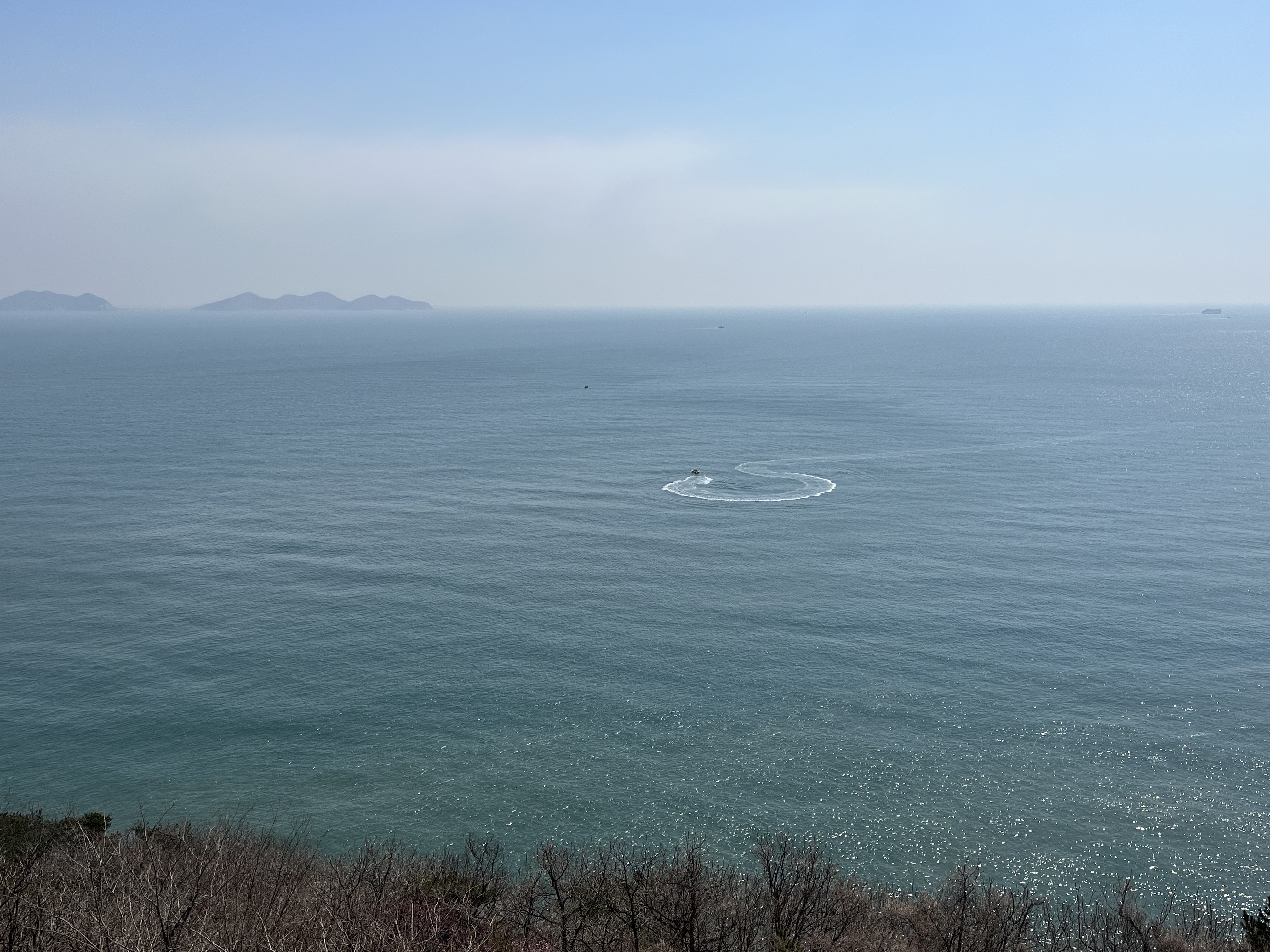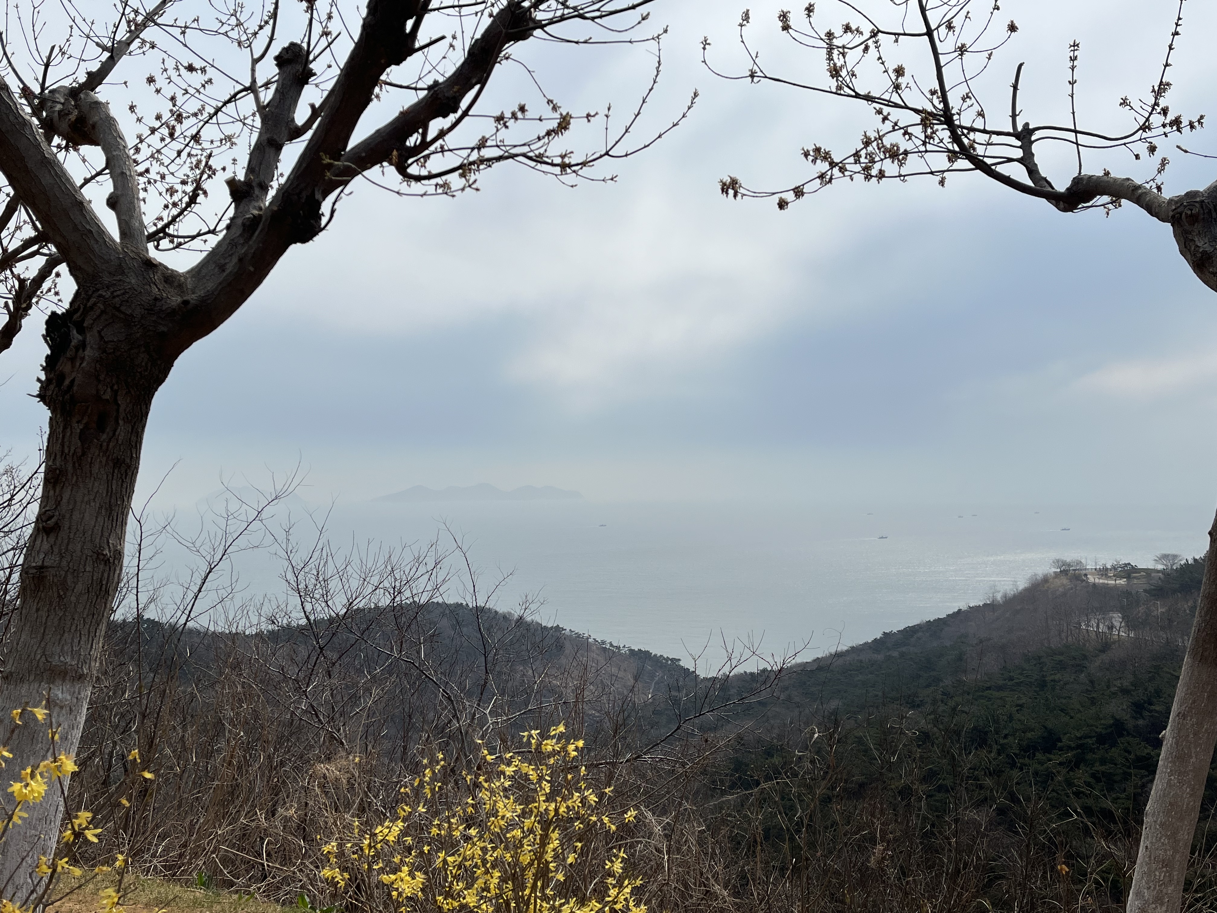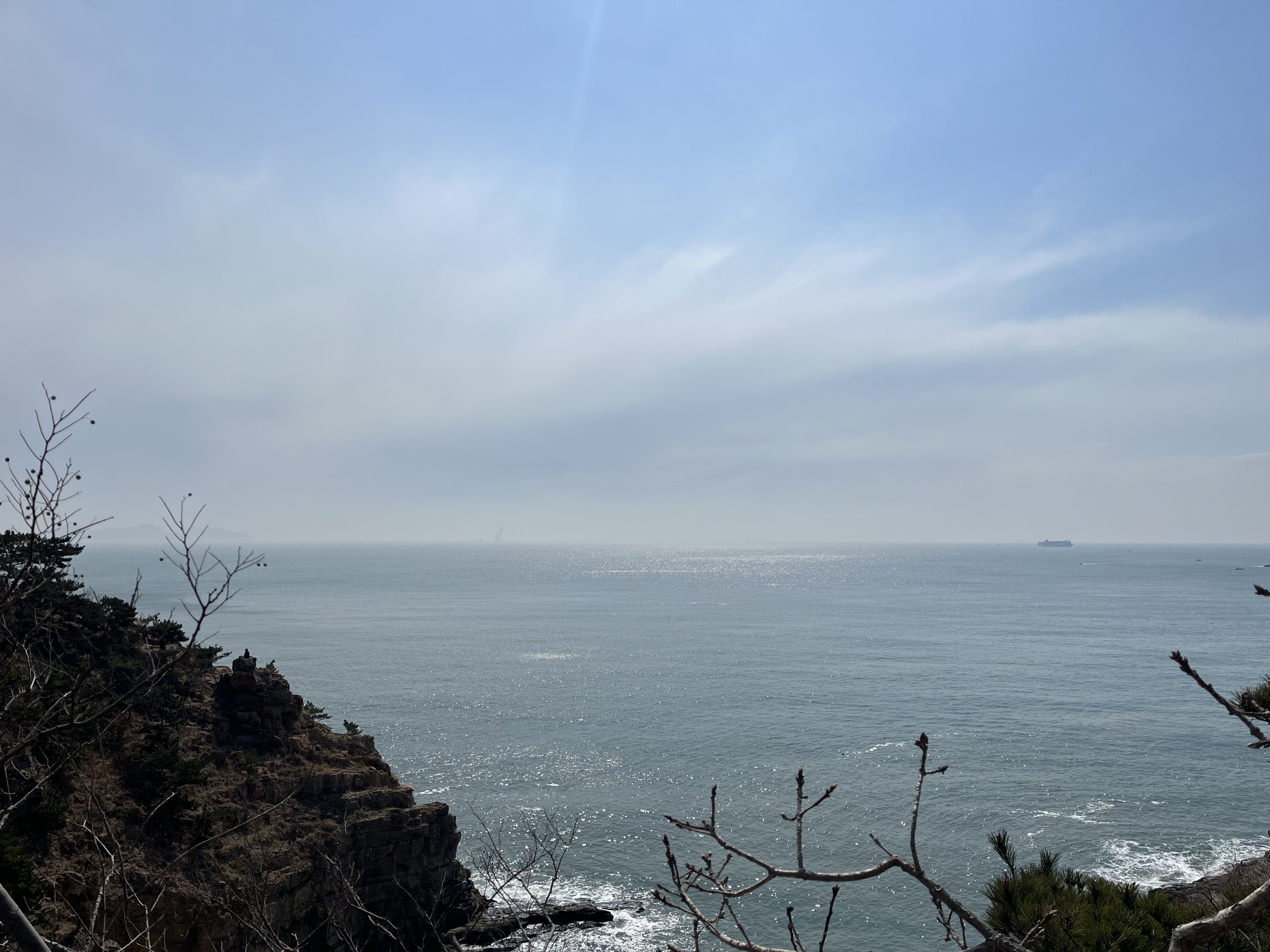7.在半山腰的地方,抓拍到了照片,两个石头山,中间是海水,由近及远、由窄变宽地延伸着。