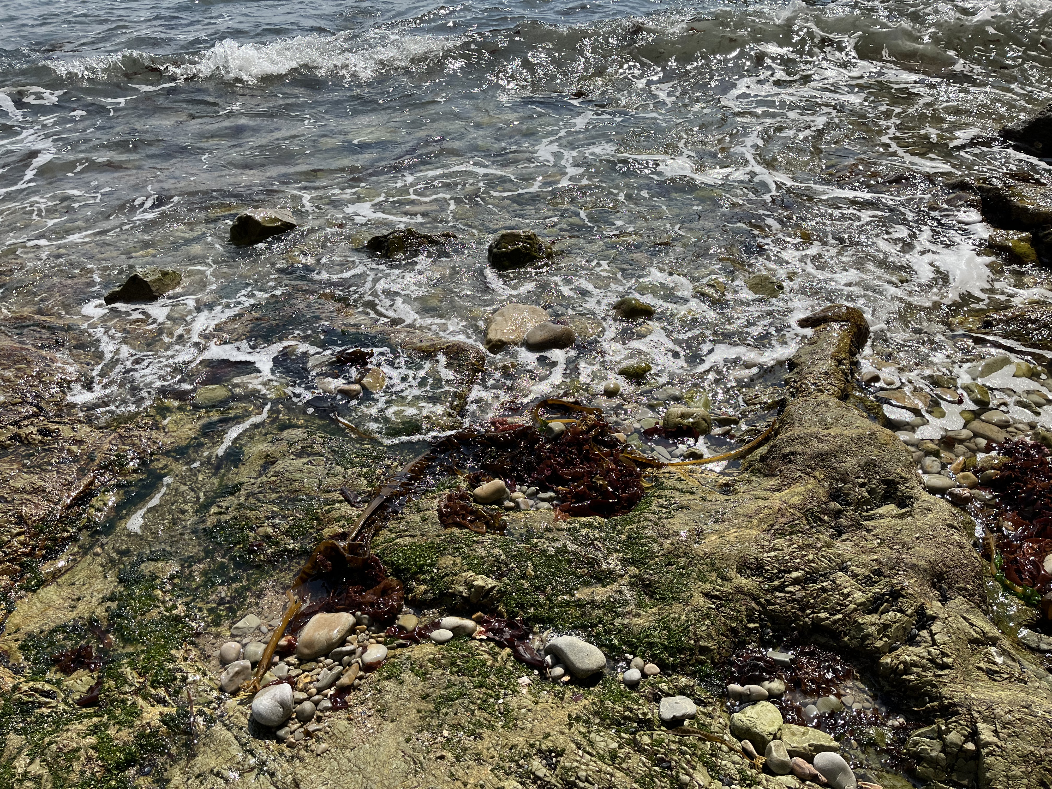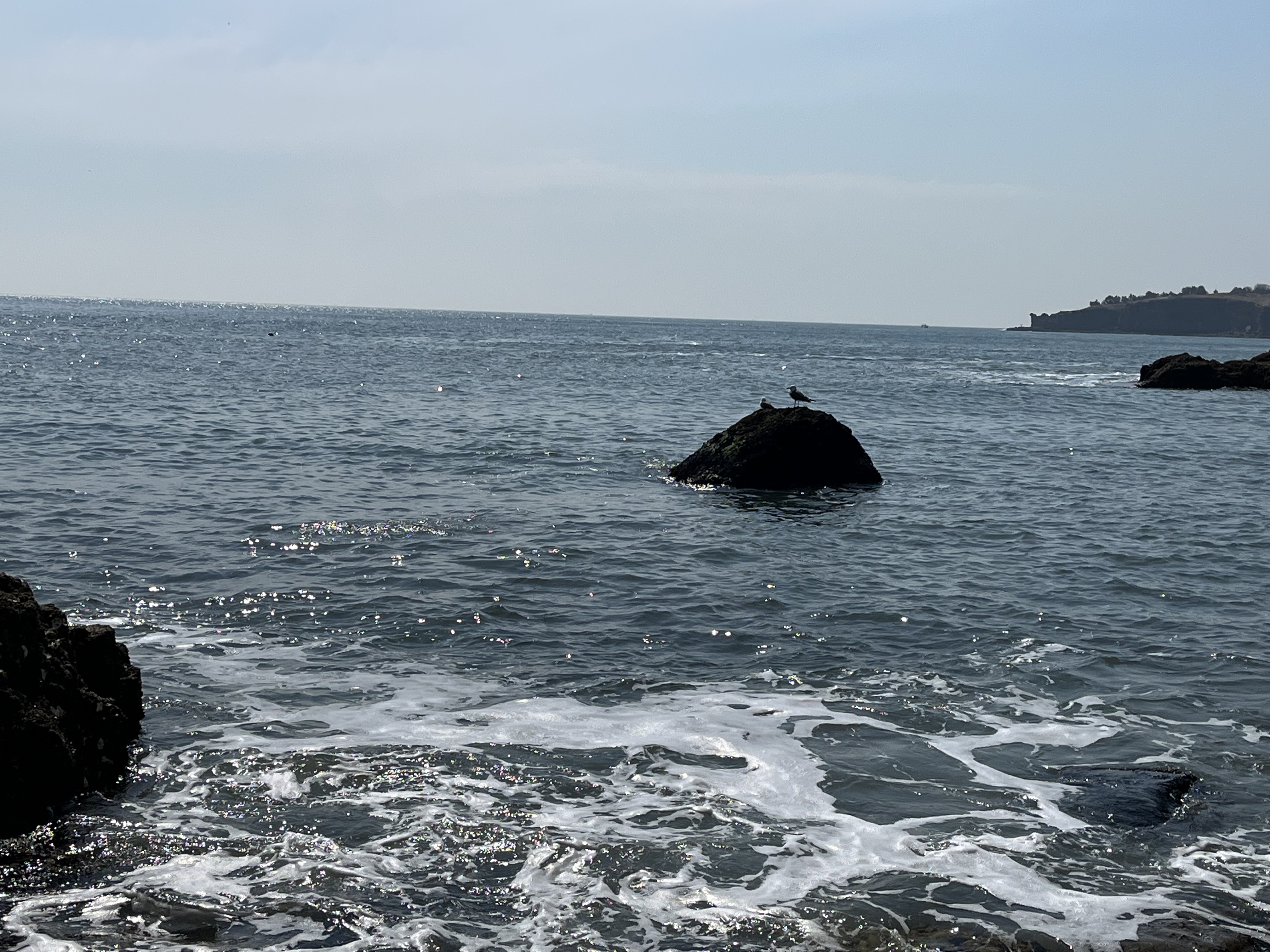 拍完海浪,拍长满青苔的石头,陆地上的,浸在海水中的,然后再拍不远处的海鸟,拍两侧的山。