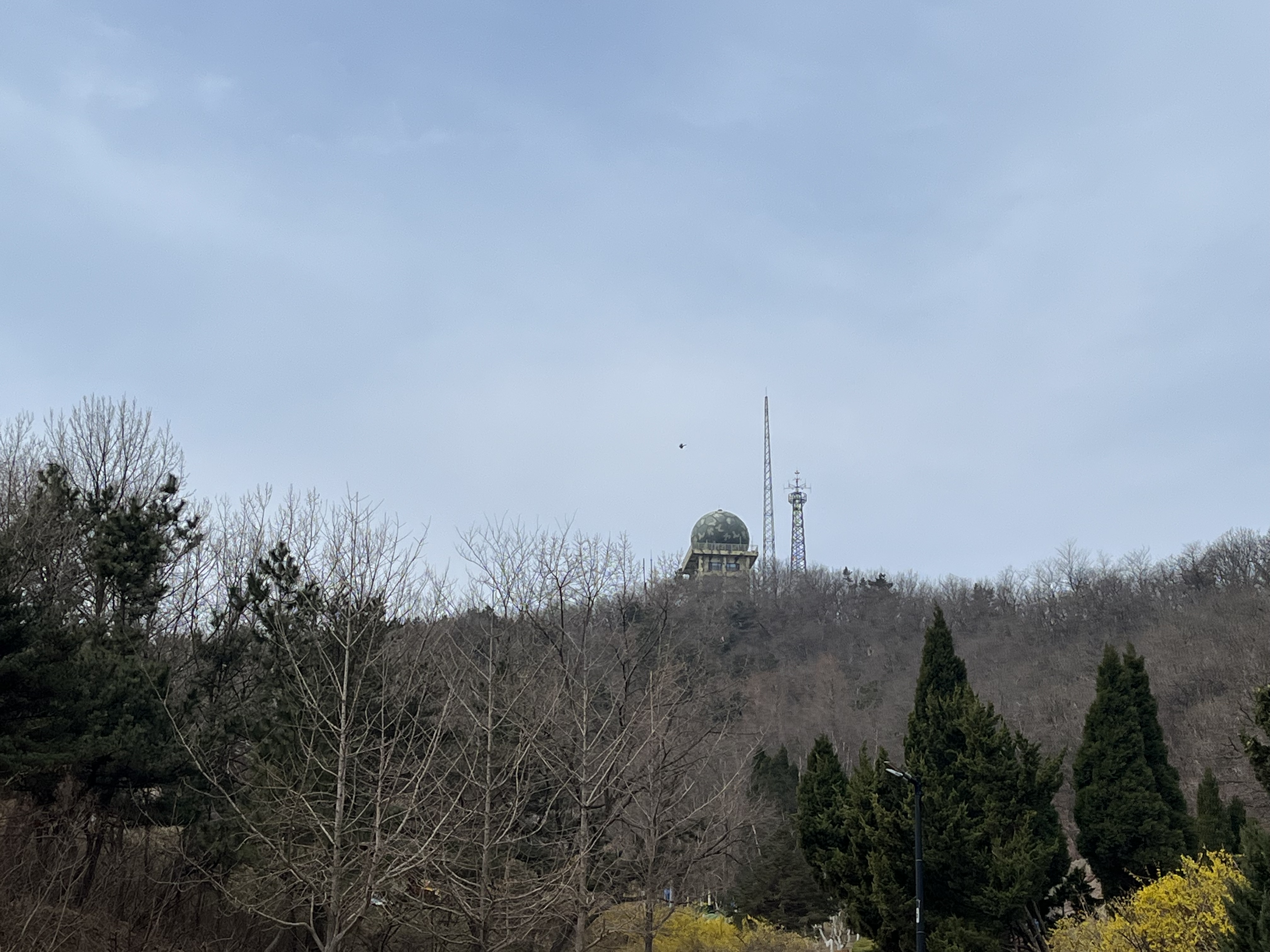 2.右前方的山上有一个信号塔,旁边的建筑顶着一个球,远处看起来,好像lalaland里面,男女主一起去的那个天文馆