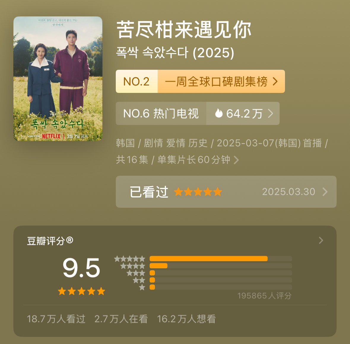 爱情的美好和亲情的共鸣让我们不约而同地想来聊一聊这部剧,本期播客也主要围绕这两个方面分享了我们的一些思考。
