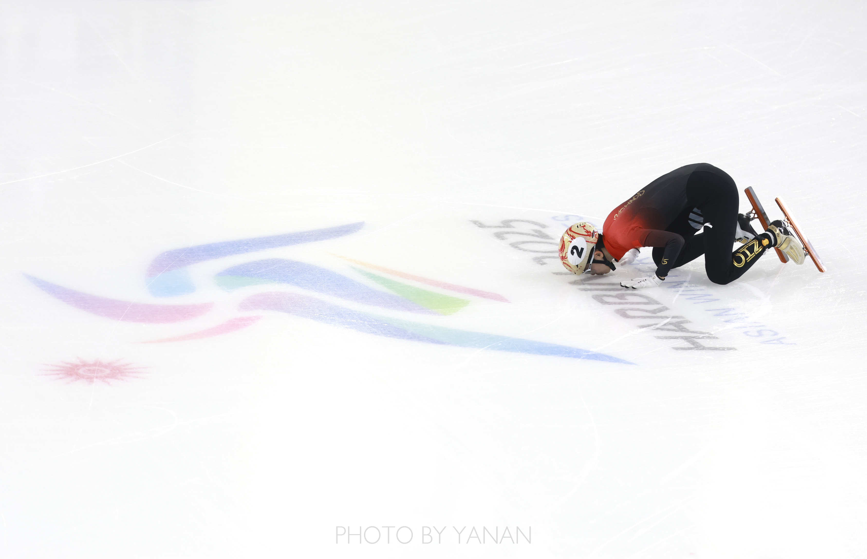 6️⃣ 2025年2月9日,中国队选手范可新在哈尔滨亚冬会获得短道速滑女子3000米接力冠军后亲吻冰面。