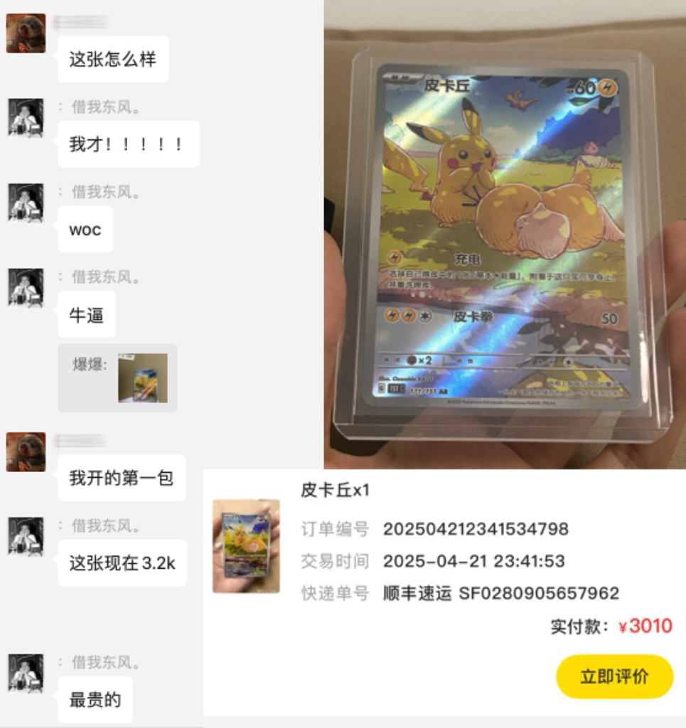 爆爆同学更是录完这期就上头去开盒,新手光环爆棚,开出了一张价值3000+的卡牌,让炒卡的东风同学也直呼太牛了!