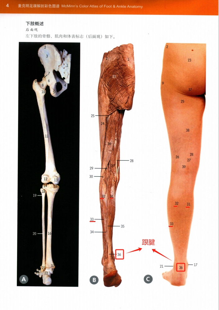 图说:腓肠肌(31,32)与比目鱼肌(33)的腱性部分汇合构成跟腱(36),即通常所说的 Achilles 腱 资料来源©《麦克明足踝解剖彩色图谱(第四版)》第4页